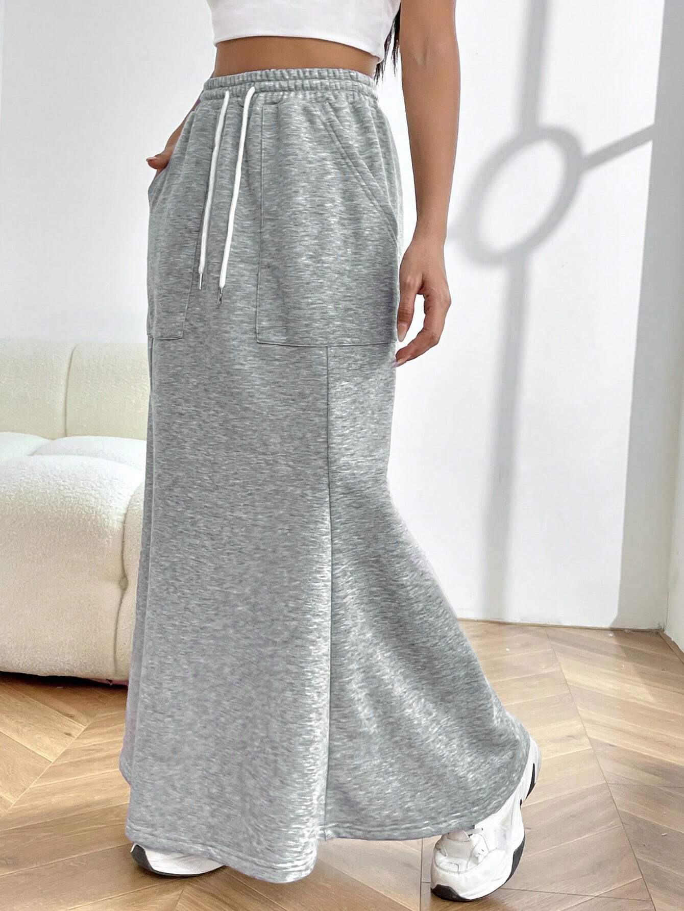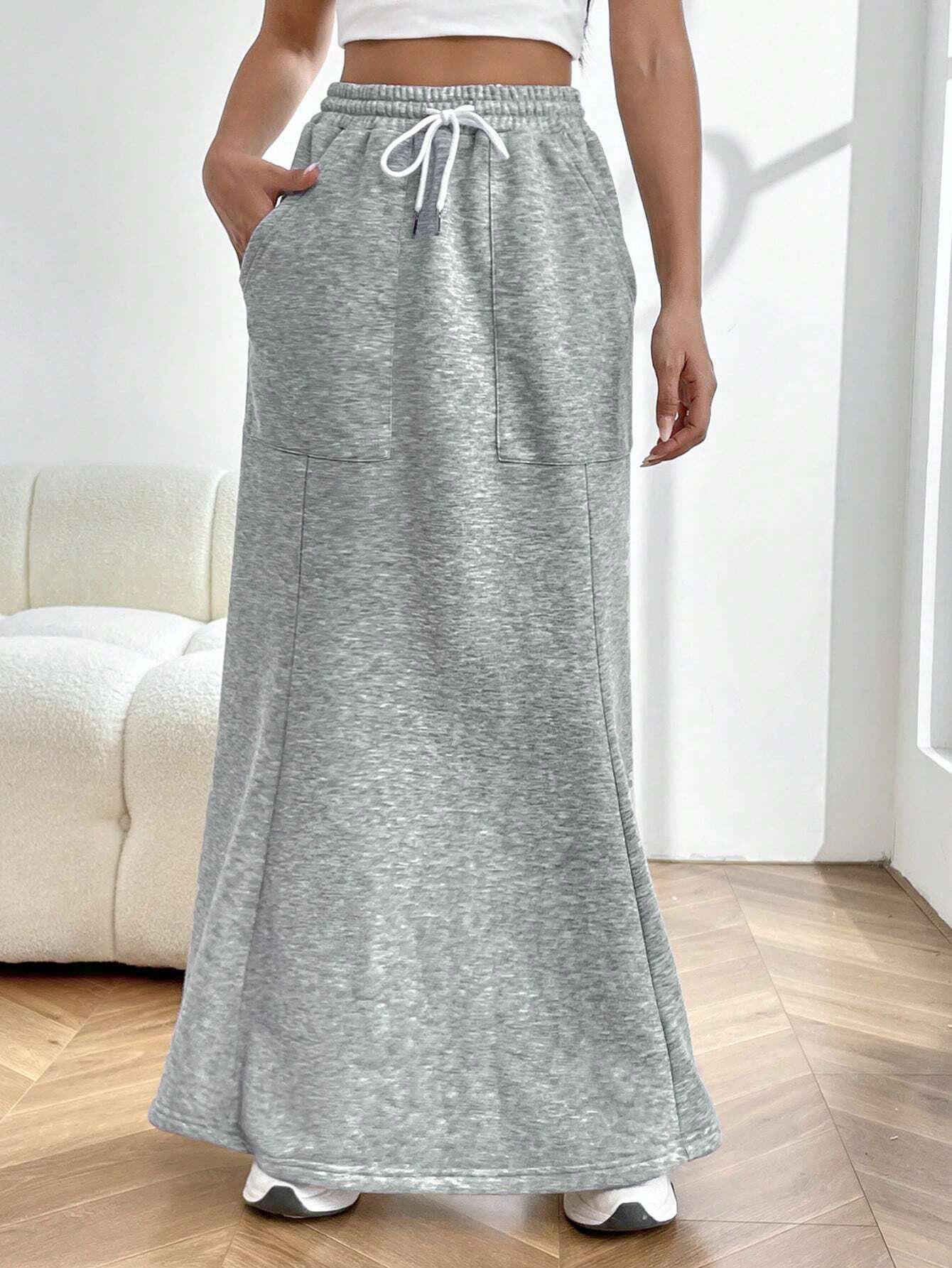 • Women's Casual Knit Midi Skirt With Pockets High Waist Drawstring Solid Grey A-Line Elastic Waist Polyester Blend Skirt For Women Daily Office Wear