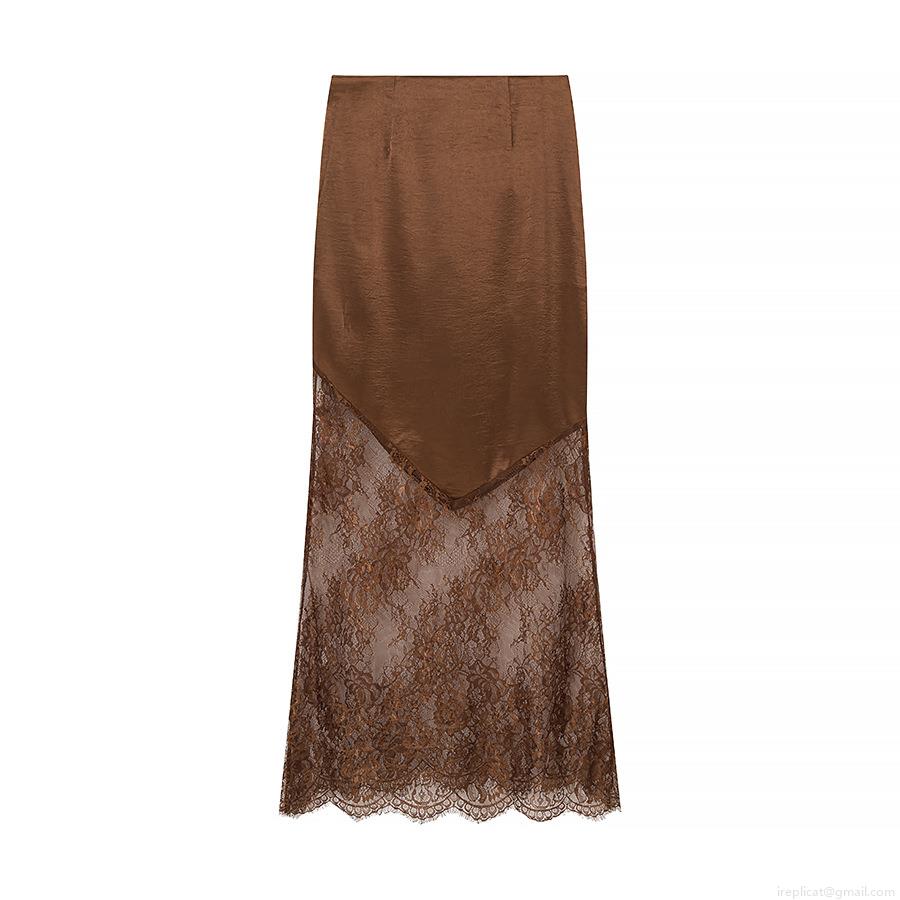 Women's Elegant Brown Satin Splicing Floral Lace Midi Skirt With Side Slit Streetwear Sexy Straight Skirts For Party Dating