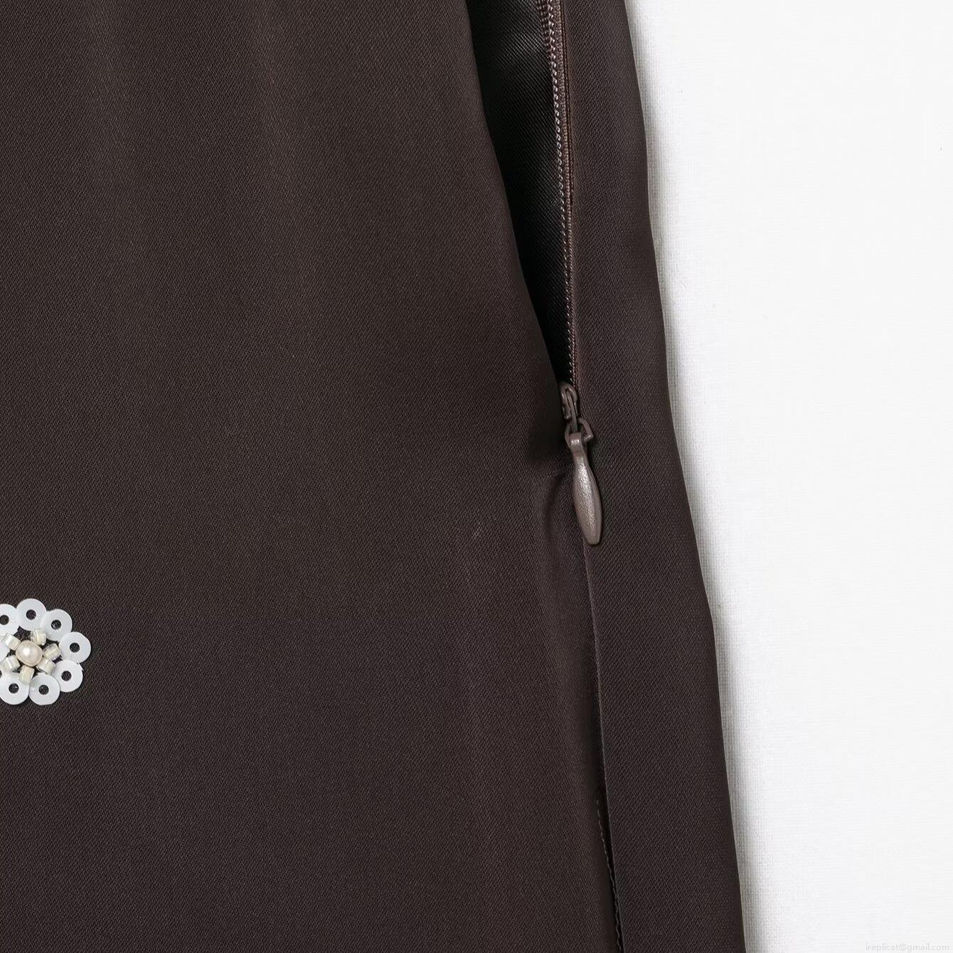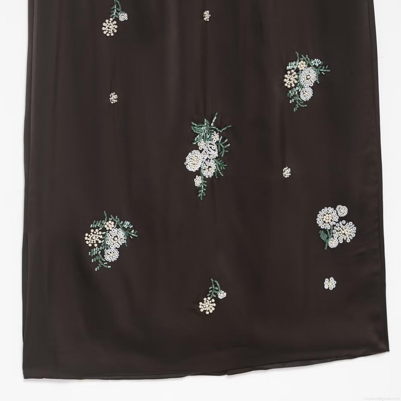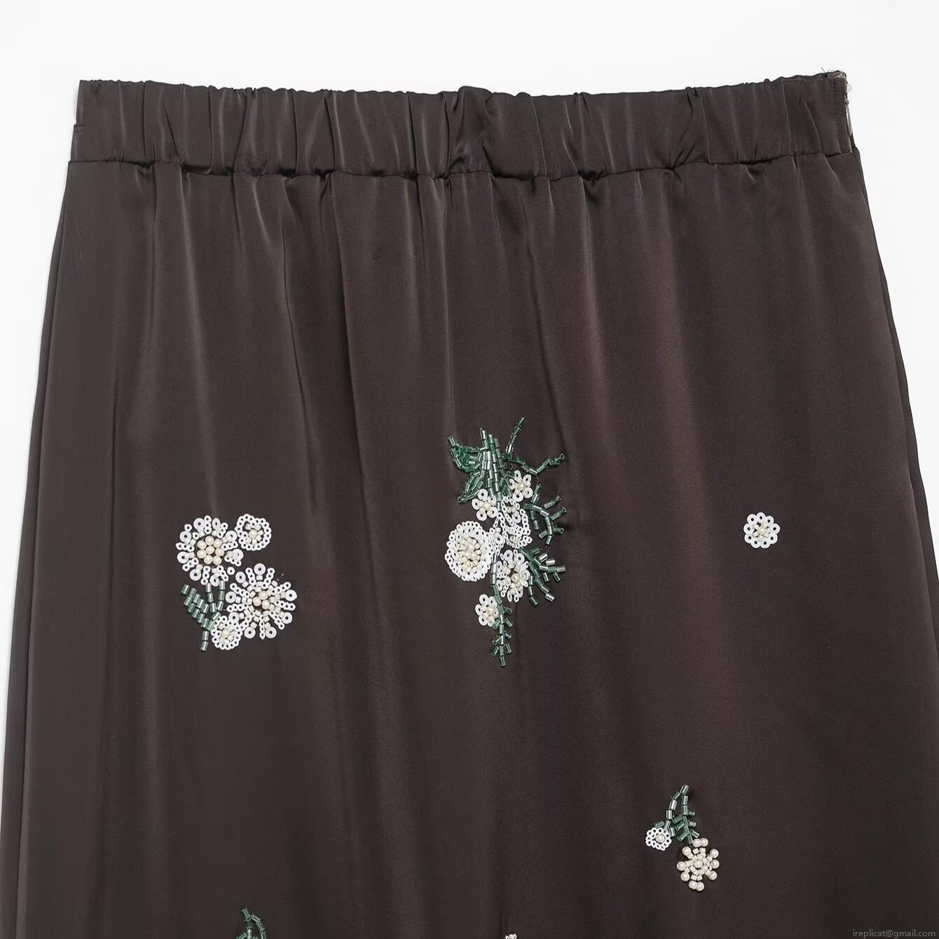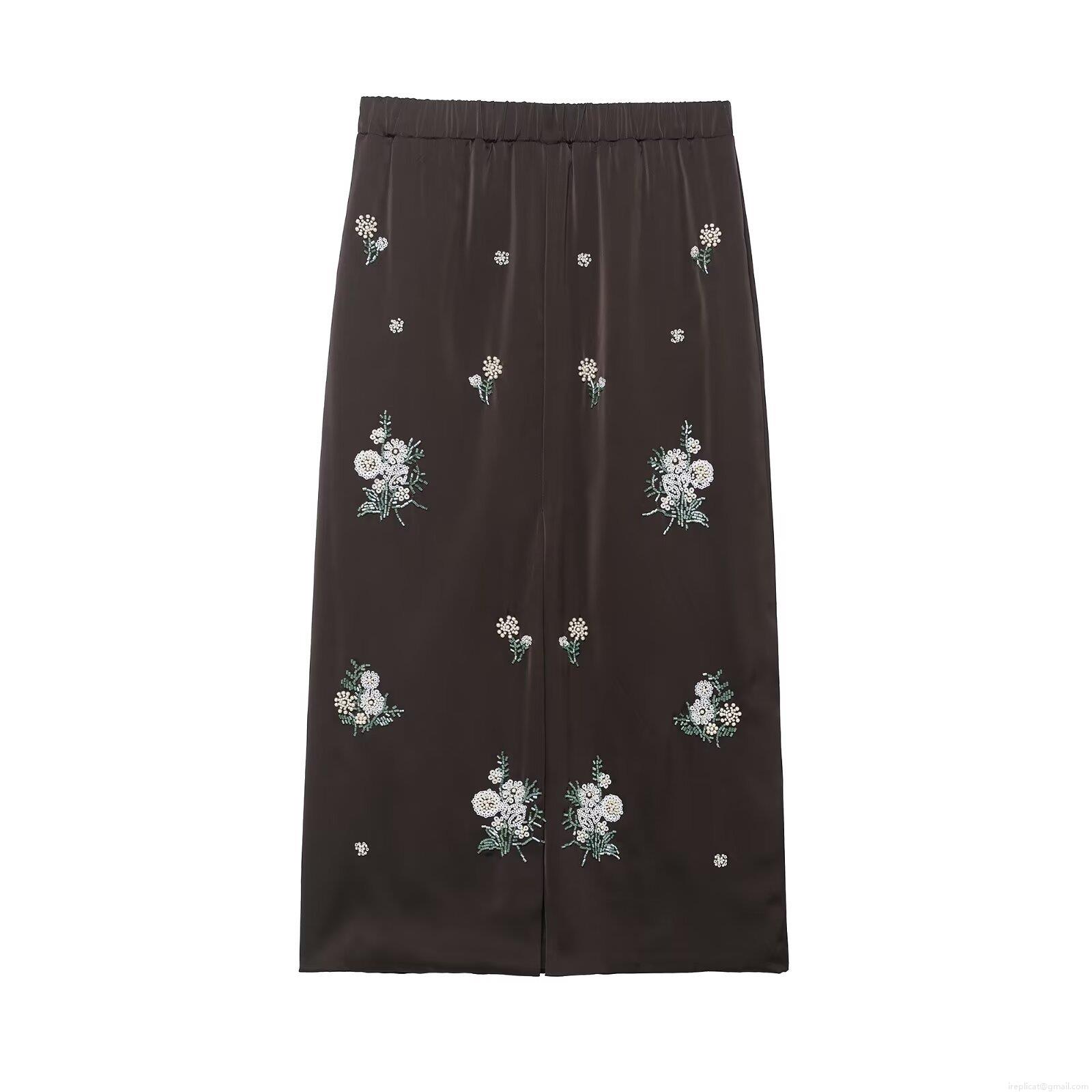 • Women's Elegant Coffee Brown Satin Midi Skirt With Flower Embroidery Sequin Beads Detail Elastic High Waist A-line Skirt For Daily Commute Party Dressing