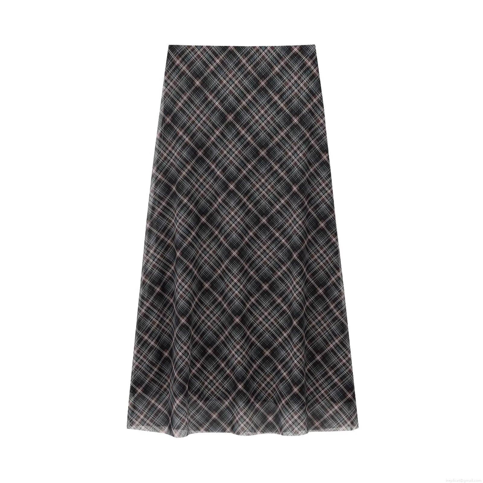 • Women's Elegant Grey Plaid A-Line Mesh Skirt High Waist Long Maxi Skirt Vintage Streetwear Casual Versatile Bottoms for Women