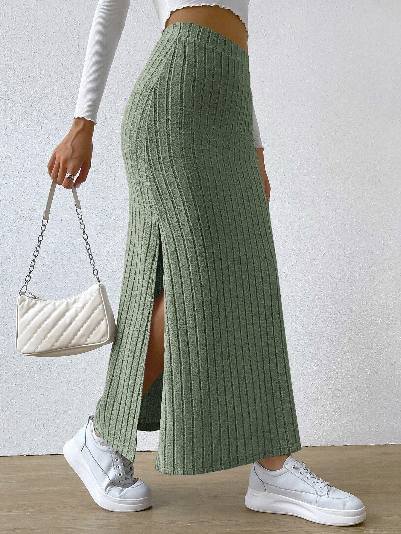 • Women's Elegant High Waist Ribbed Knit Maxi Skirt Side Slit Slim Fit Polyester Elastane Long Bodycon Pencil Skirts For Casual Daily Work Party