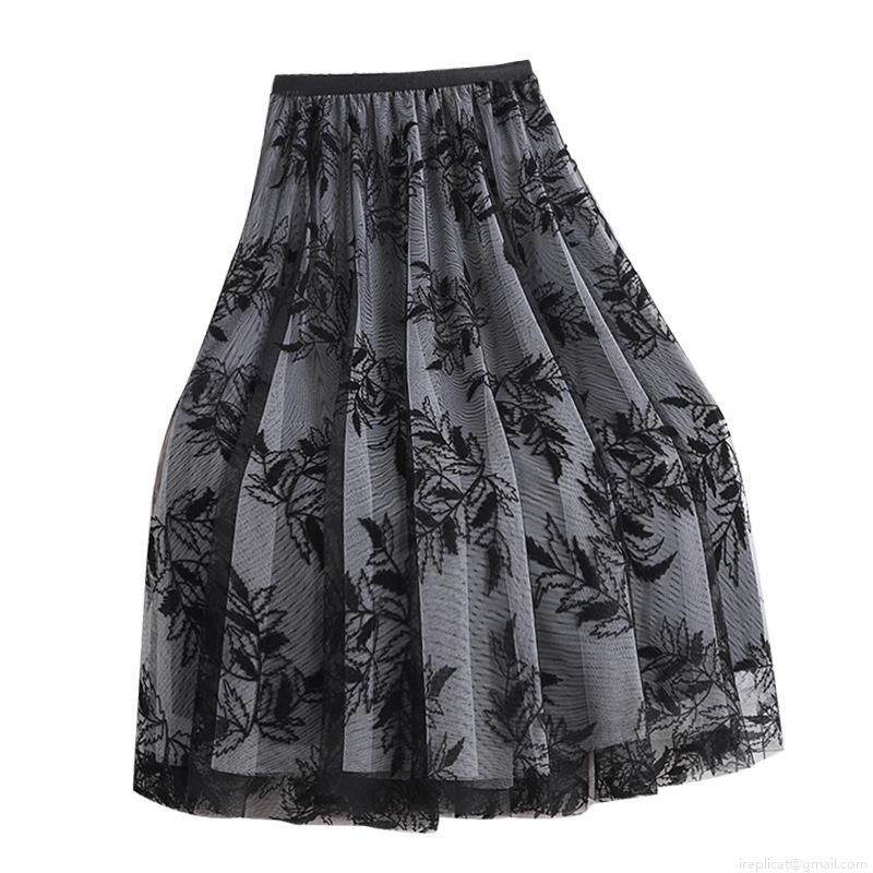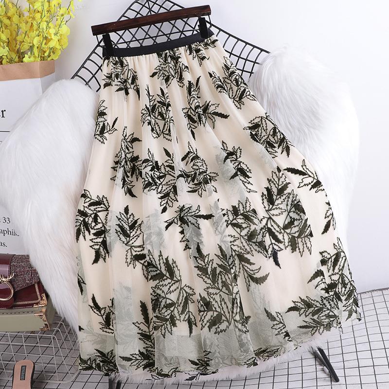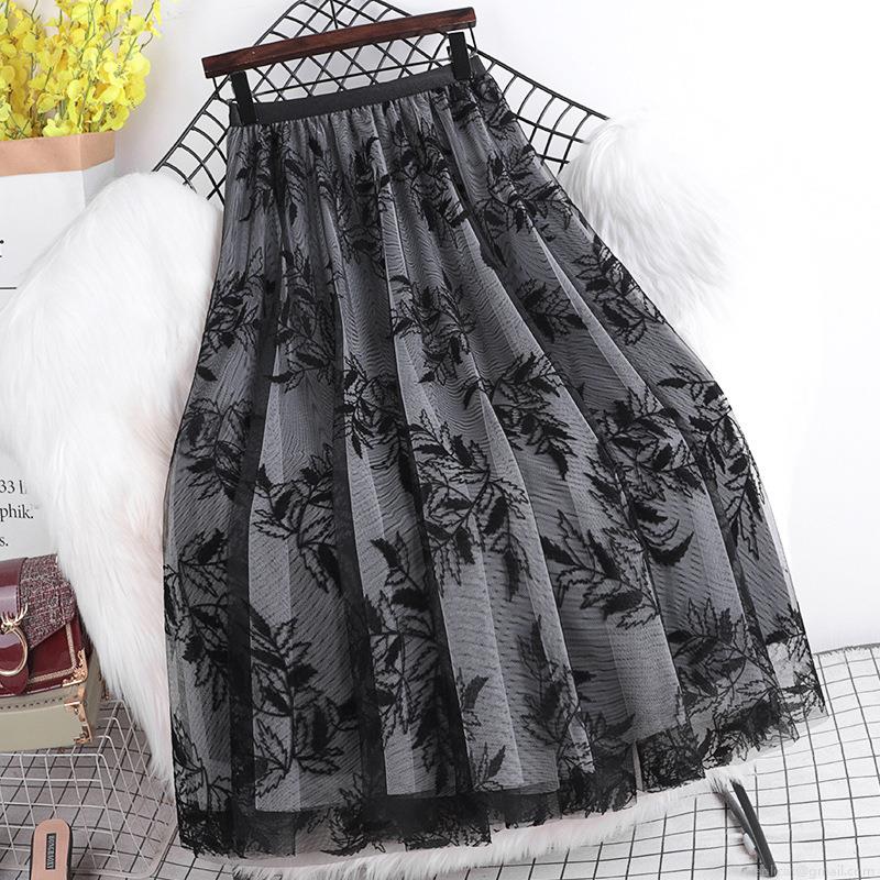 • Women's Elegant Leaf Embroidered Mesh Midi Skirt High Waist A-Line Double Layer Tulle Skirt For Autumn Winter Office Daily Commute Fashion Drape Long Skirts