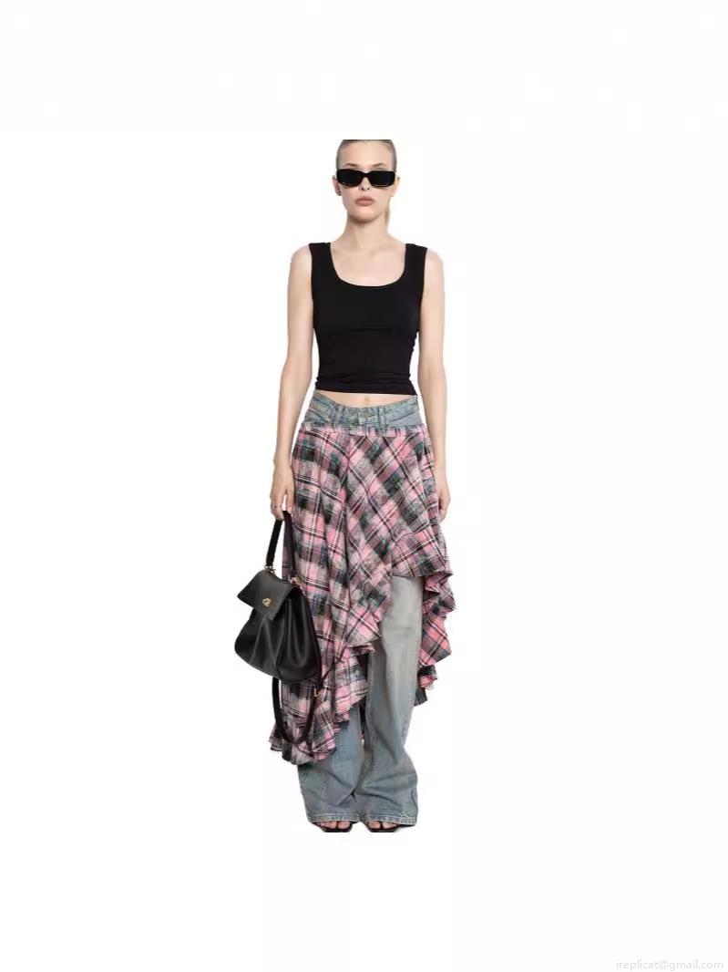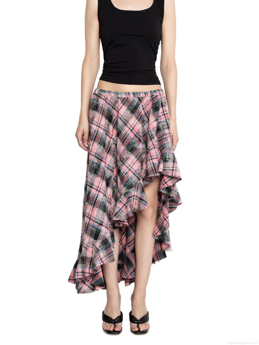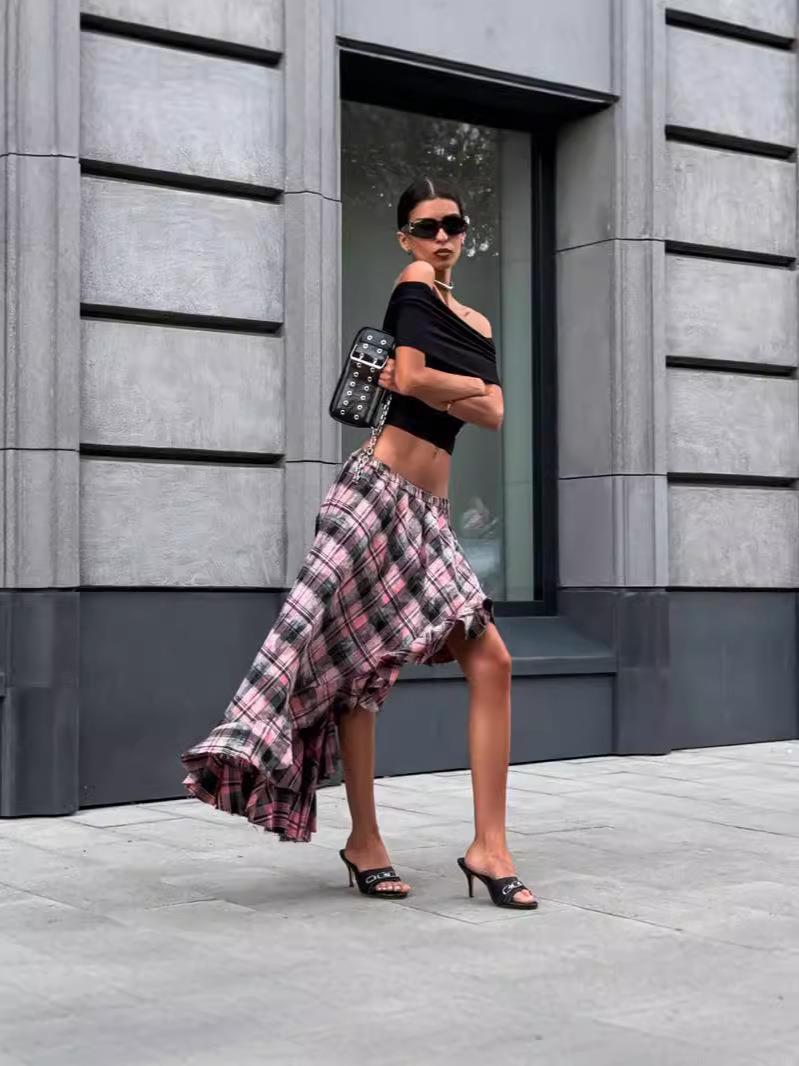 • Women's Elegant Plaid Irregular Midi Skirt High Waist Asymmetric Ruffle Cotton Blend Woven Pink Houndstooth Skirt For Daily Commuting Office Dating
