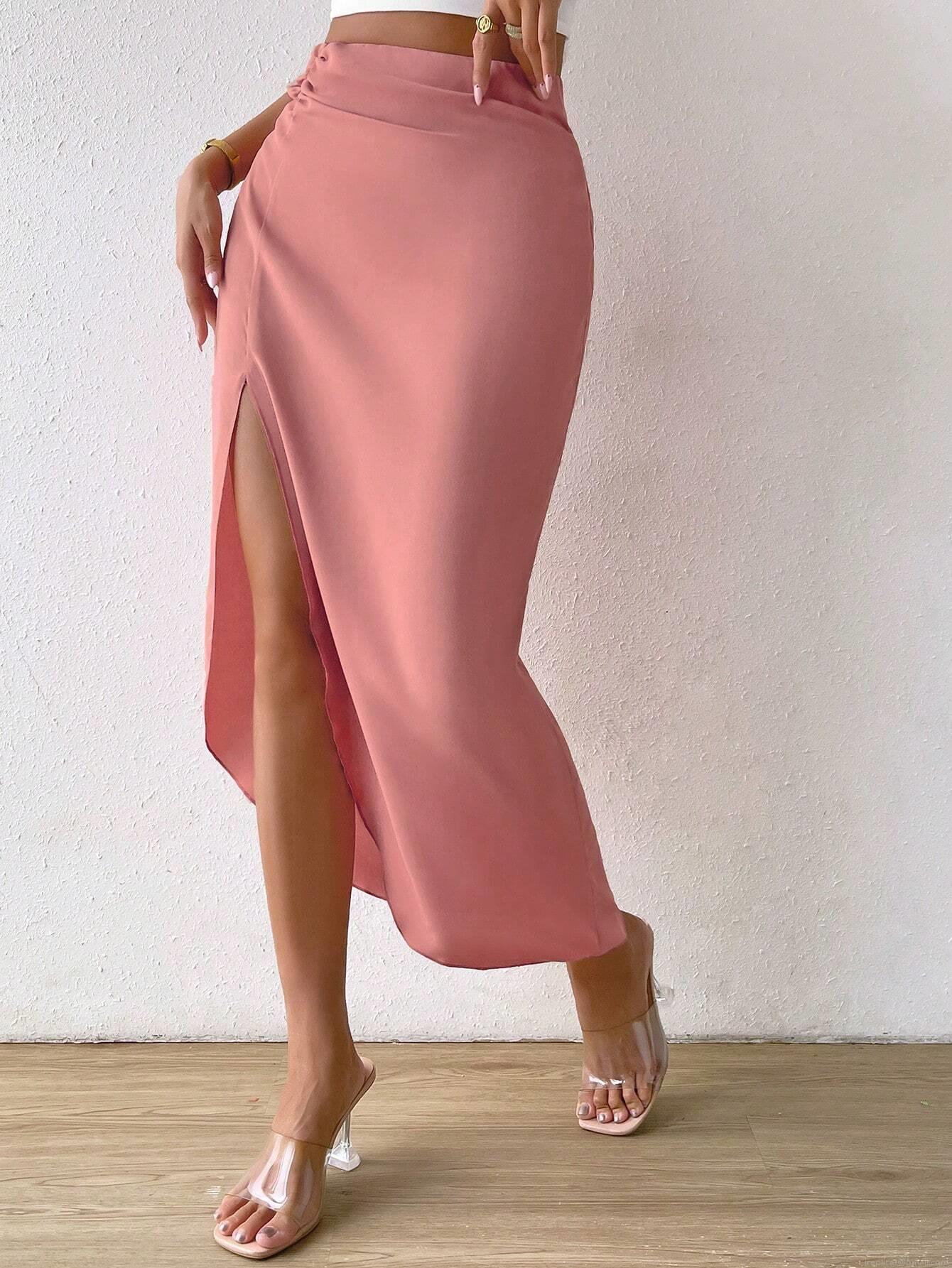 • Women's Elegant Satin Side Slit Midi Skirt High Waist Ruched Solid Color Party Office Bodycon Skirt For Women