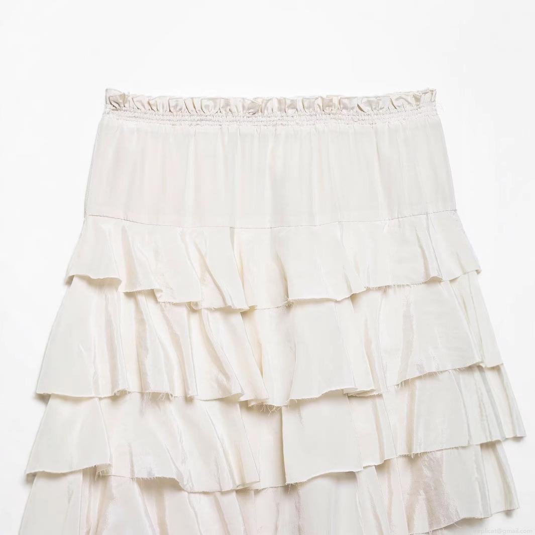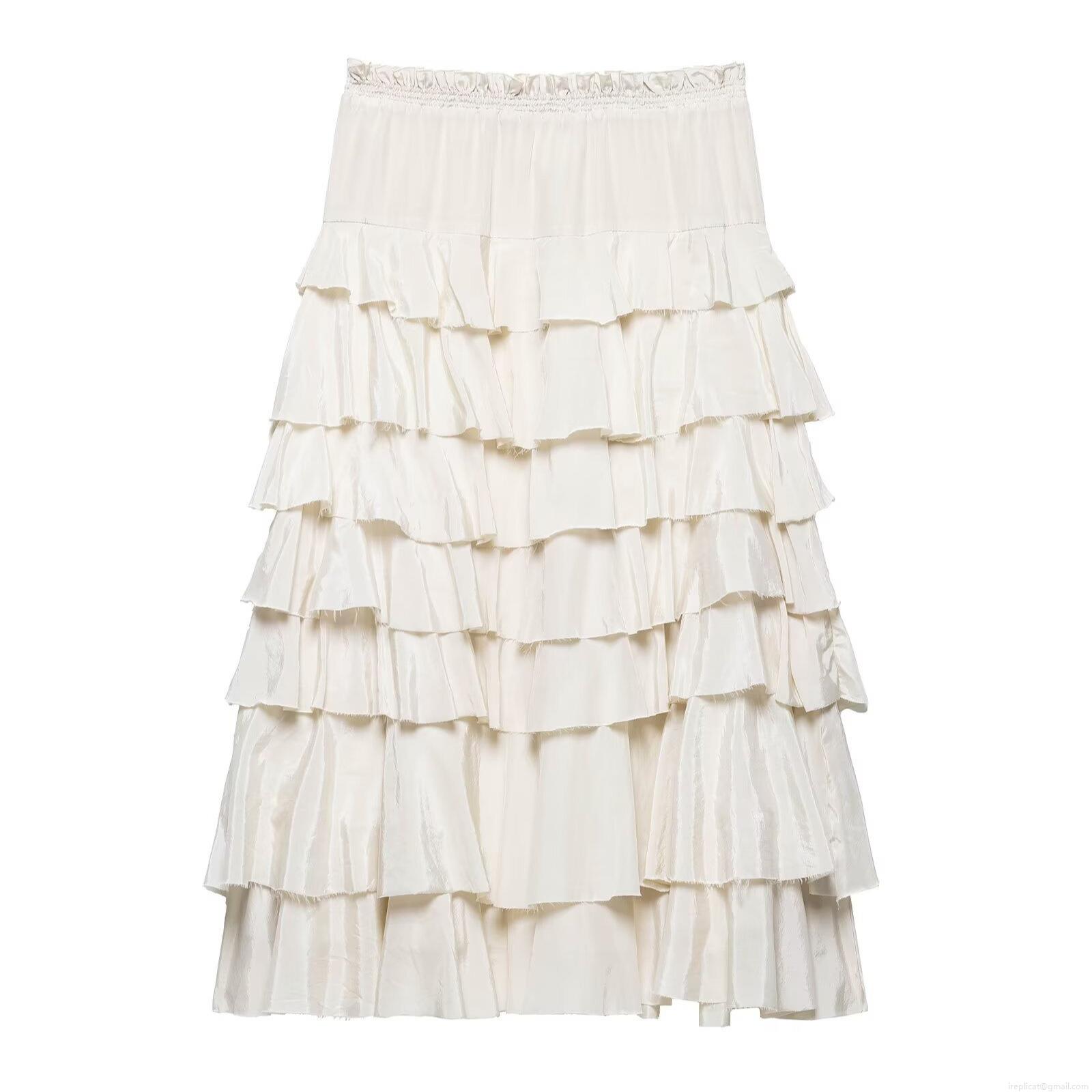 • Women's Elegant Tiered Cake Skirt Satin Luster Polyester Ruffle Midi Skirt Elastic High Waist Street Style Solid Color Apricot Skirt for Dating Daily Wear