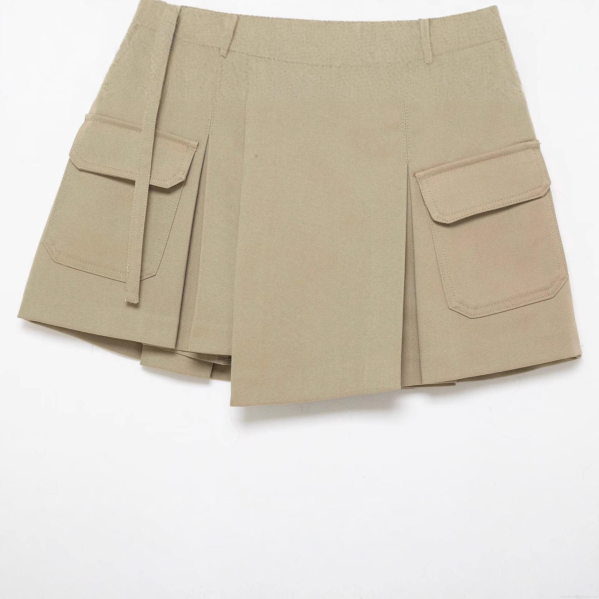Women's Fashion Cargo Mini Skirt Polyester Twill Khaki Wrap Design With Pockets And Metal Buckle Belt Streetwear Casual Skort For Women Daily Wear