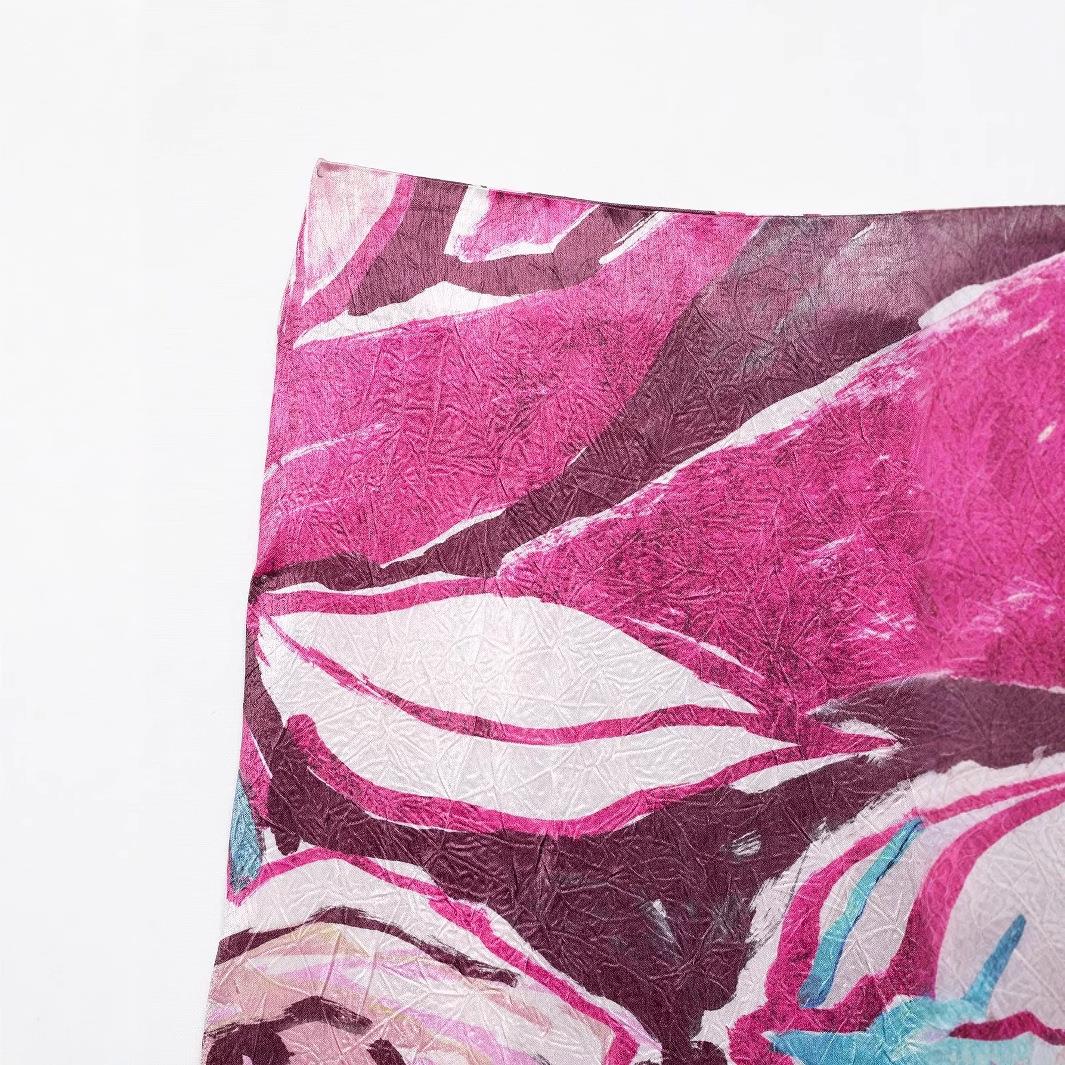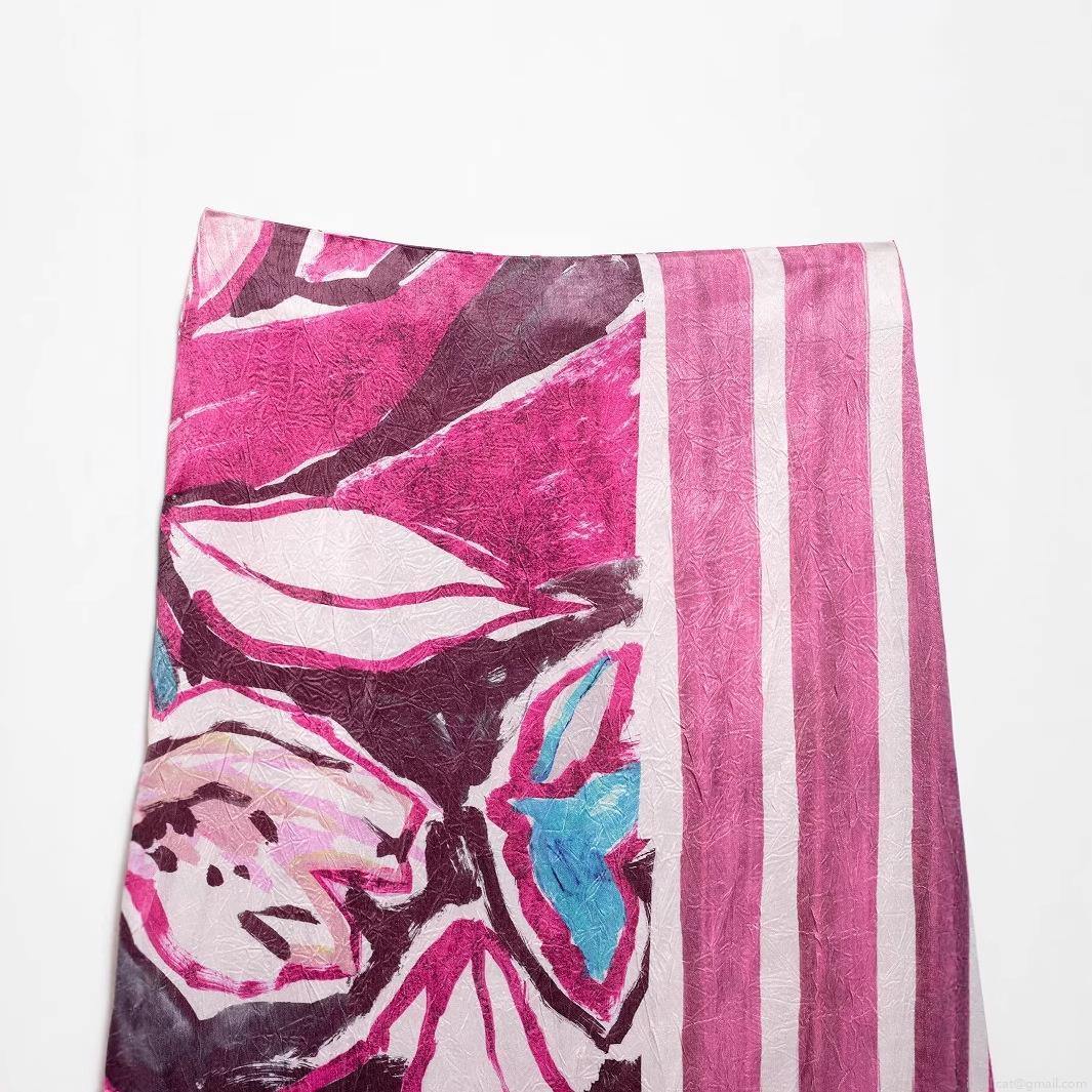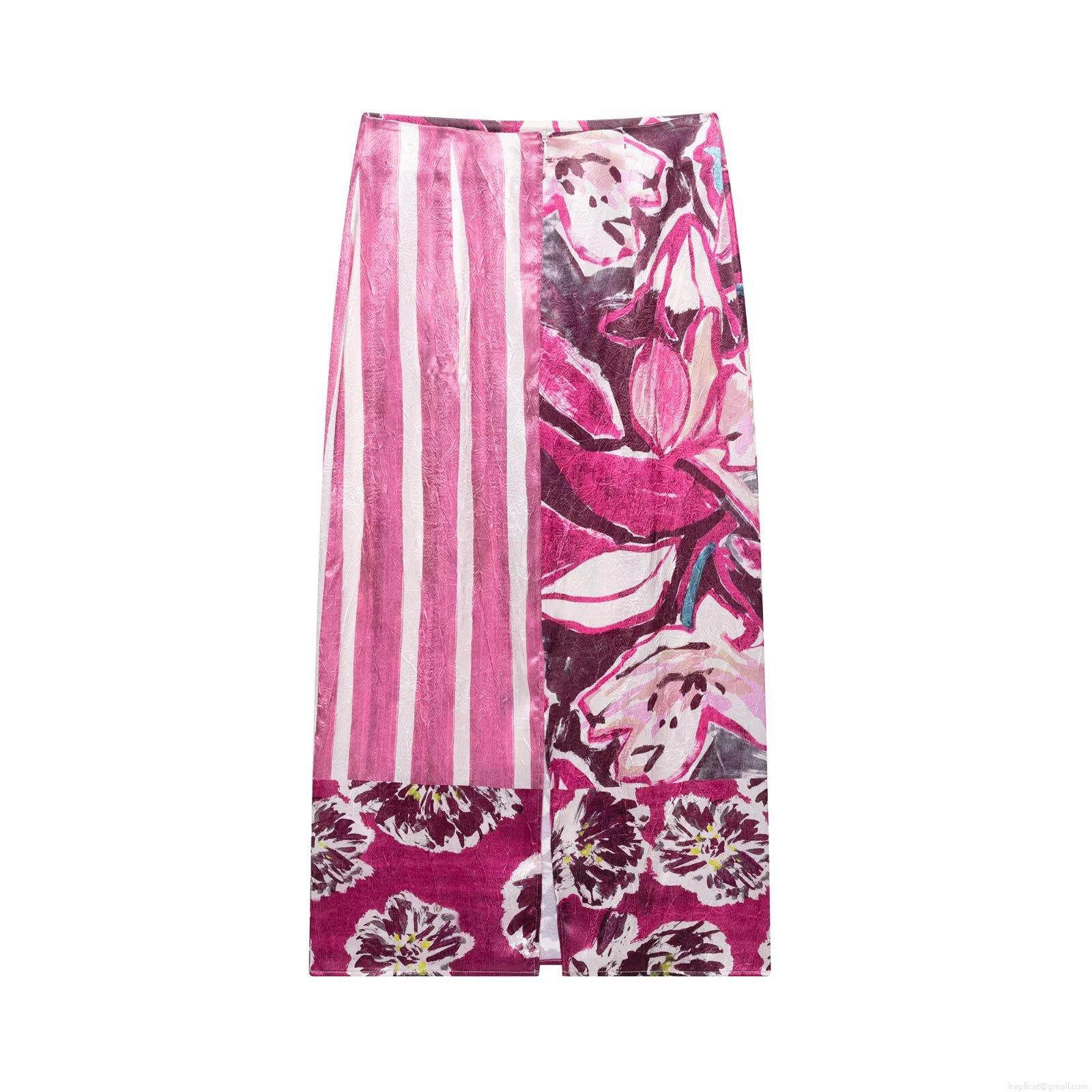 Women's Fashion Floral Print Satin Midi Skirt French High Waist Pleated Straight Skirt Patchwork Striped Patterned Skirt For Party Streetwear