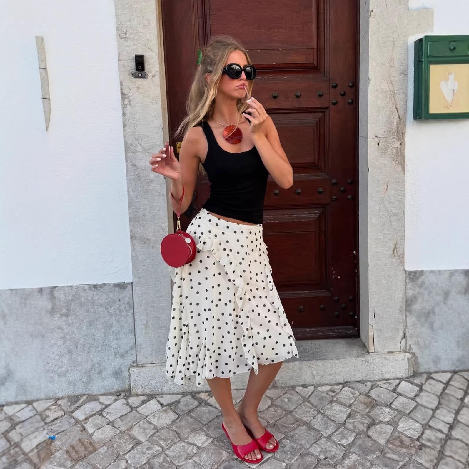 • Women's Fashion Polka Dot Ruffle Skirt 100% Polyester Chiffon Texture Irregular Hem Short Mini Skirt French Retro Summer Casual Party Bottoms Streetwear For Women