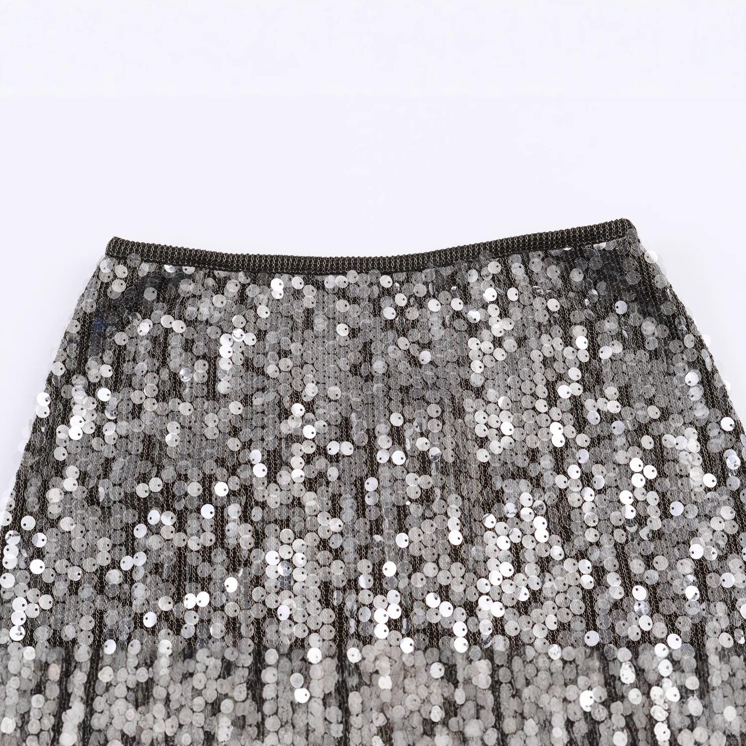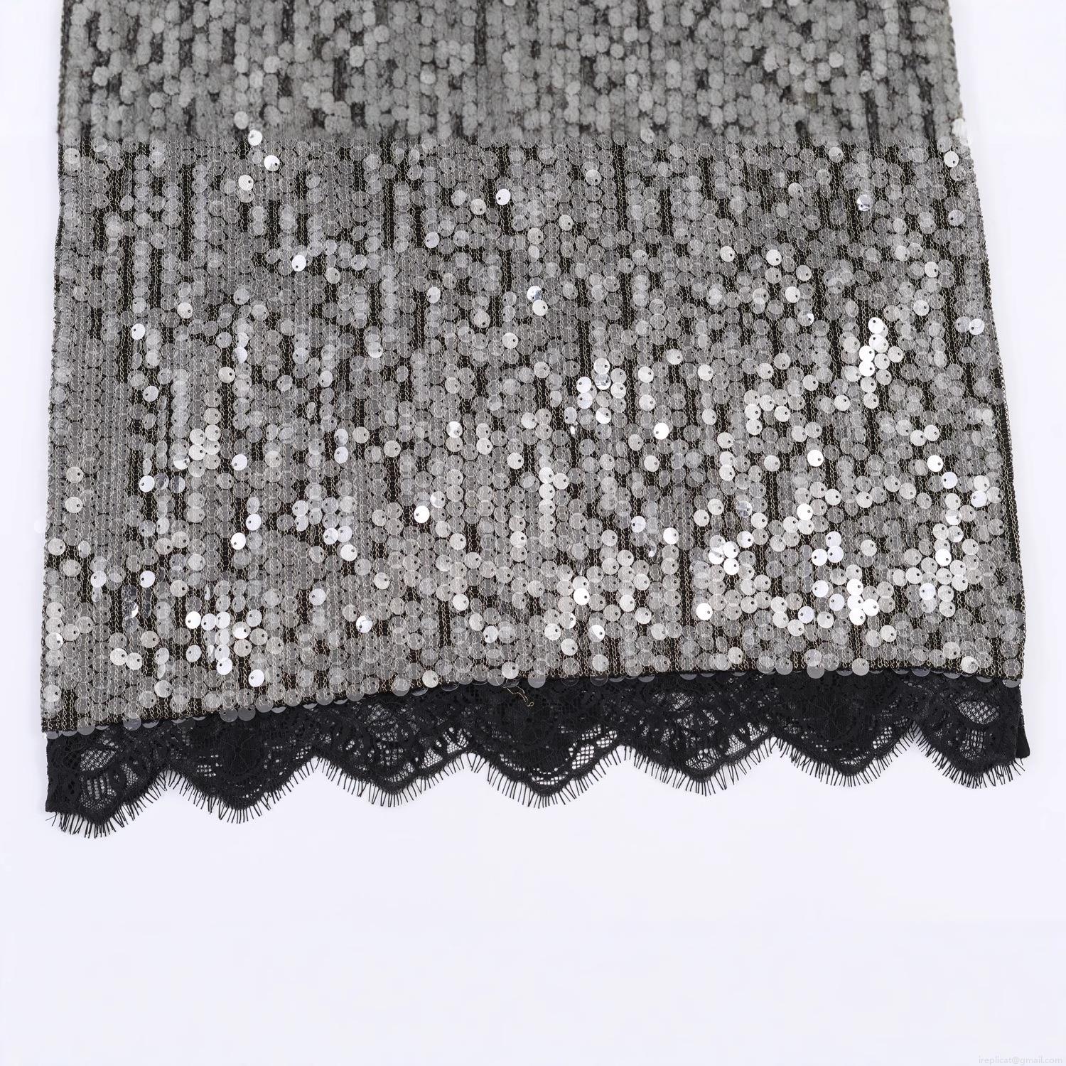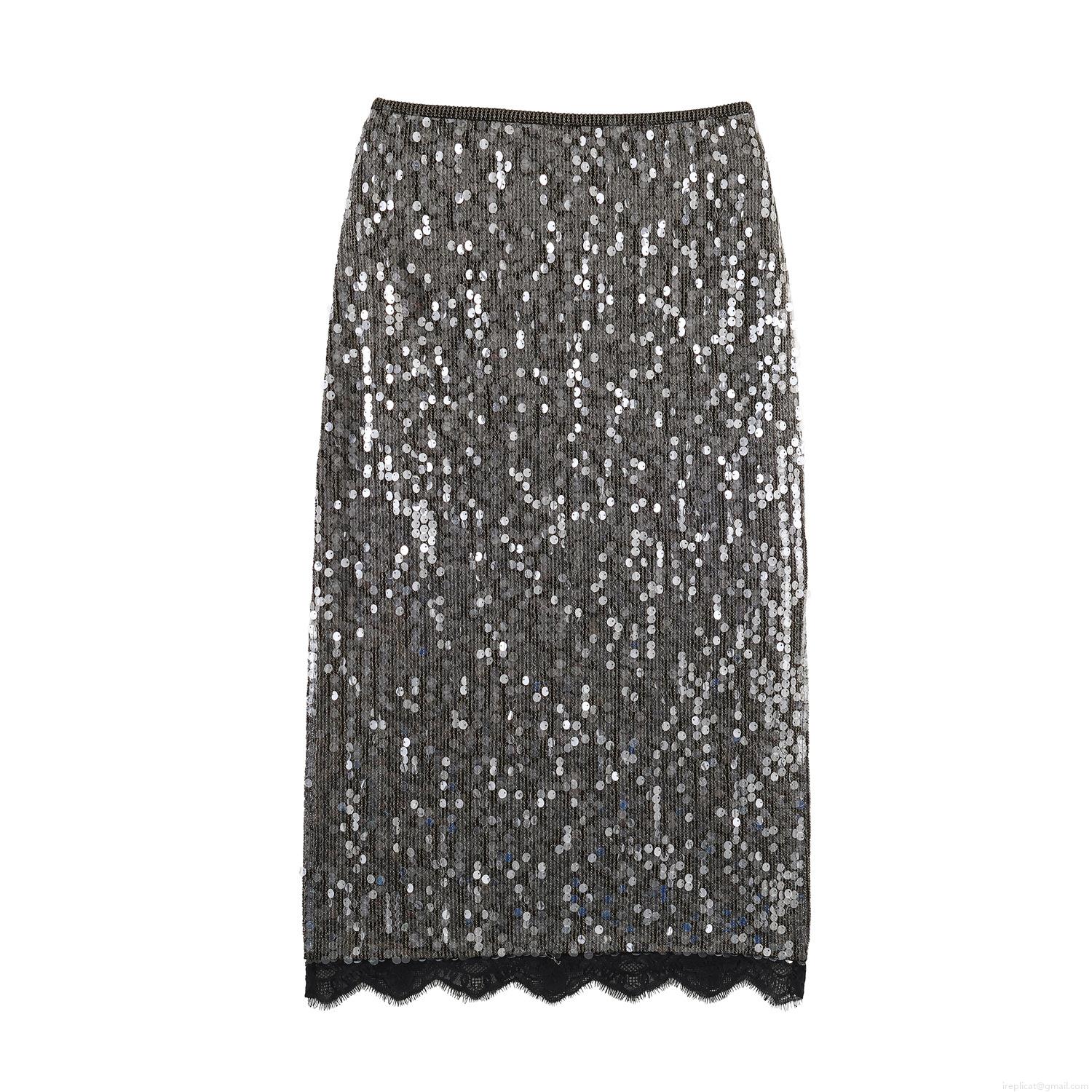 • Women's Fashion Silver Sequined Midi Skirt With Black Lace Hem Elegant High Waist Slim Fit Party Clubwear Evening Skirt For Women