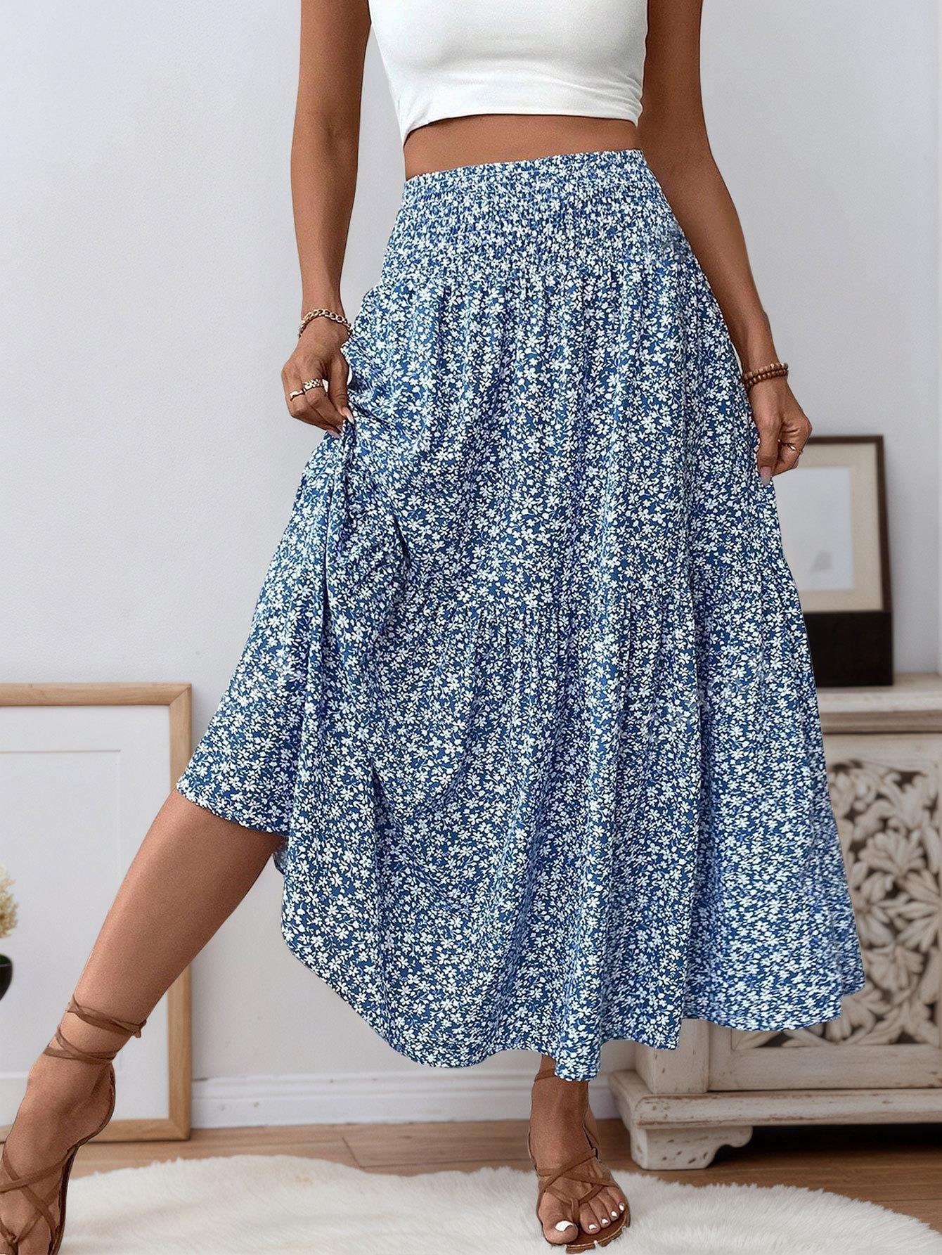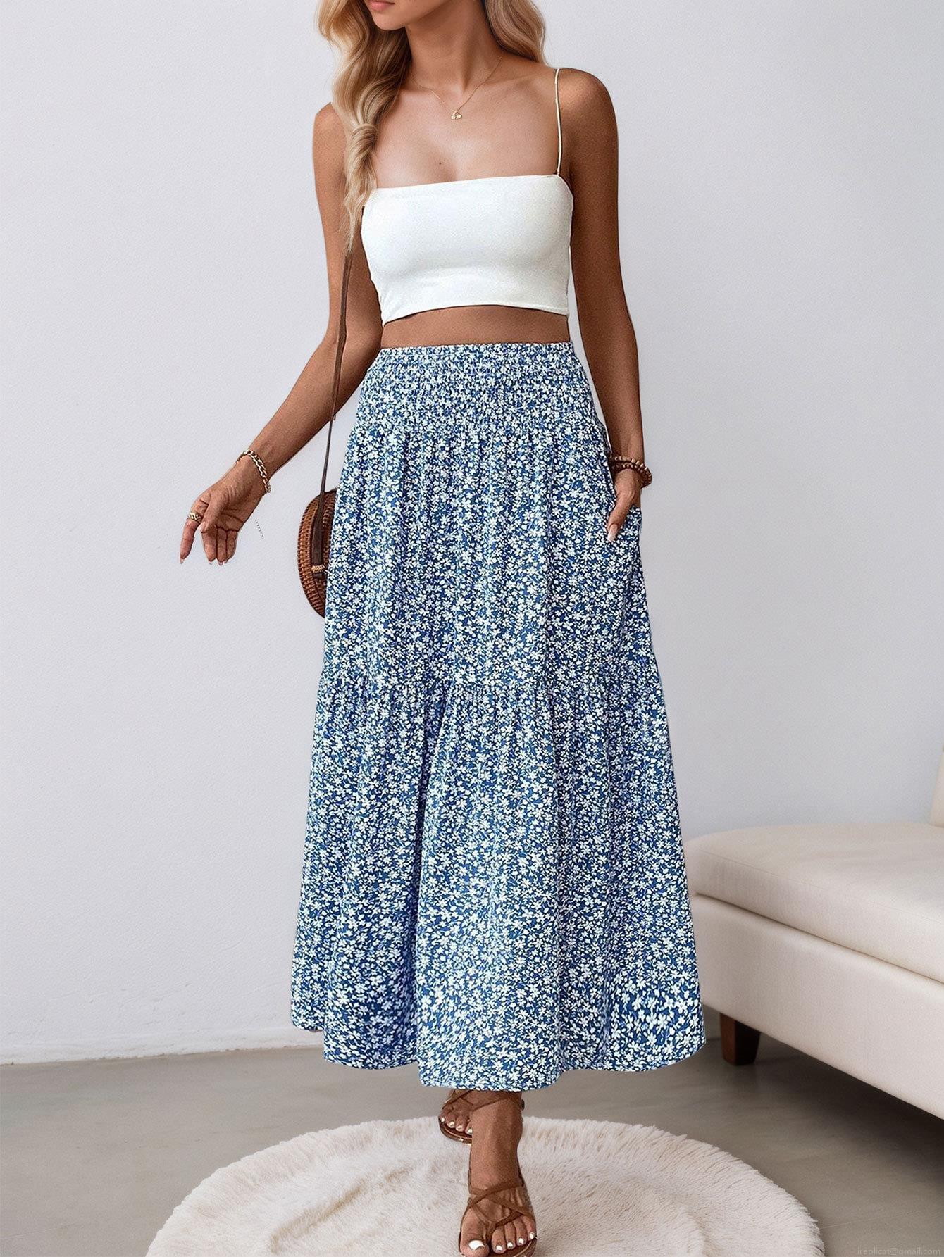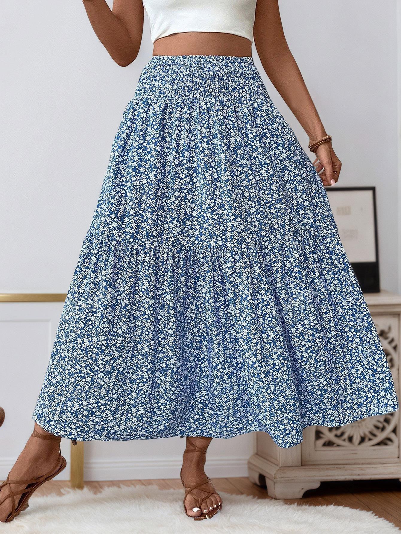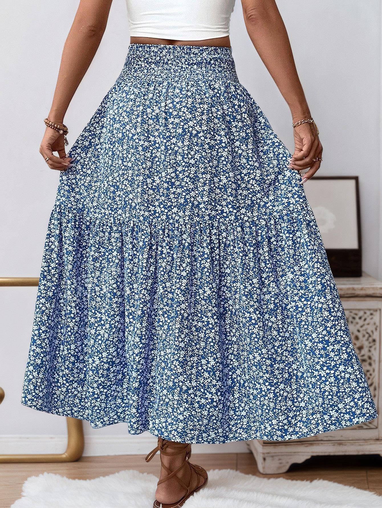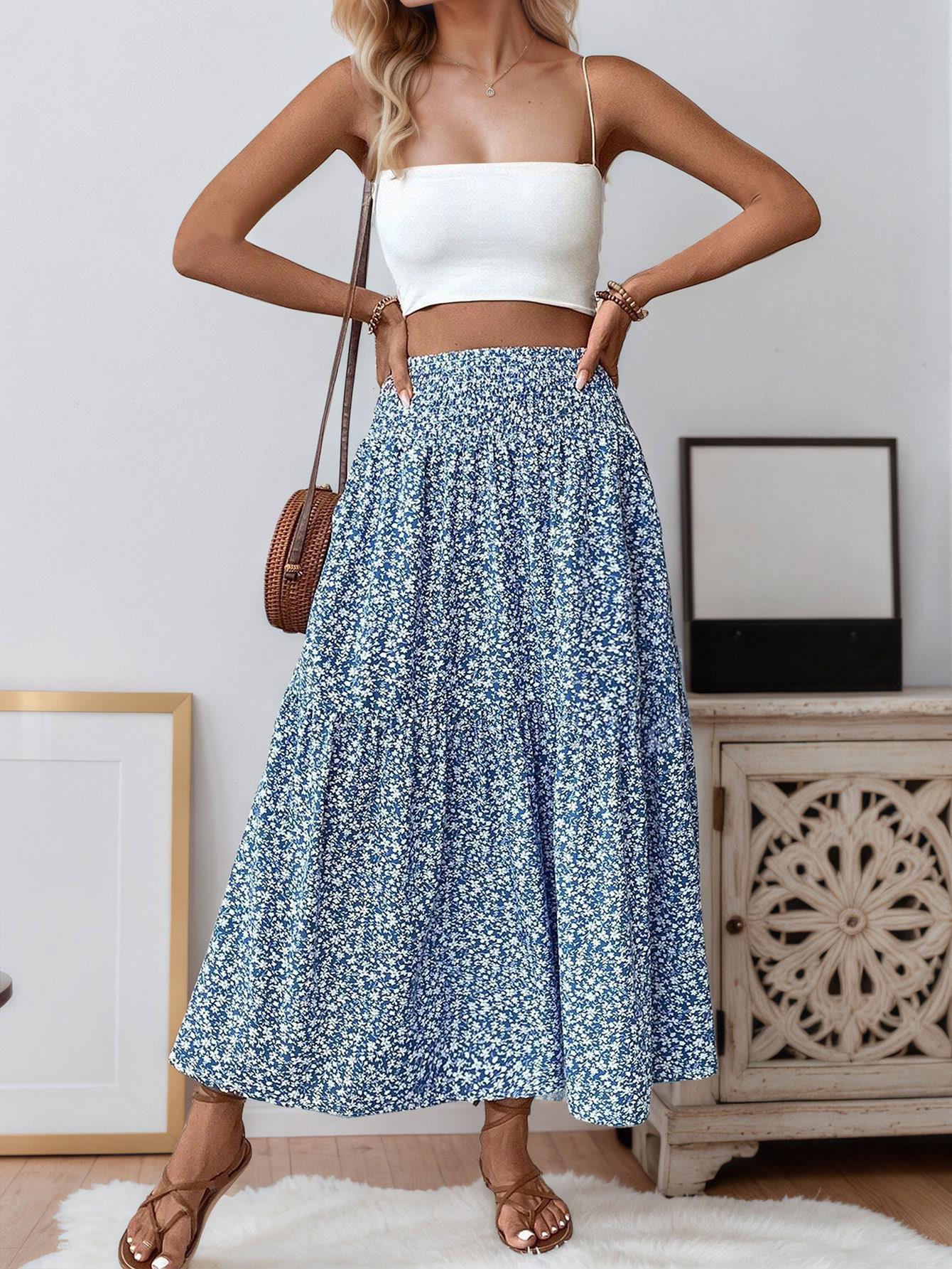 • Women's Floral Maxi Skirt High Waist Elastic Tiered A-Line Skirt Boho Summer Vacation Long Skirt Lightweight Polyester Spandex Blend Casual Beach Skirt for Women