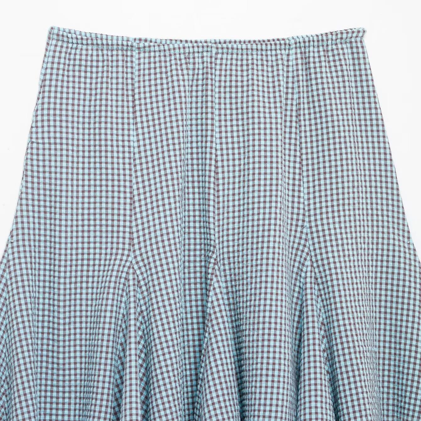 Women's Gingham A-Line Midi Skirt Sweet Blue Plaid High Waist Elastic Swing Skirt Patchwork Seersucker Skirt for Teenagers Ladies