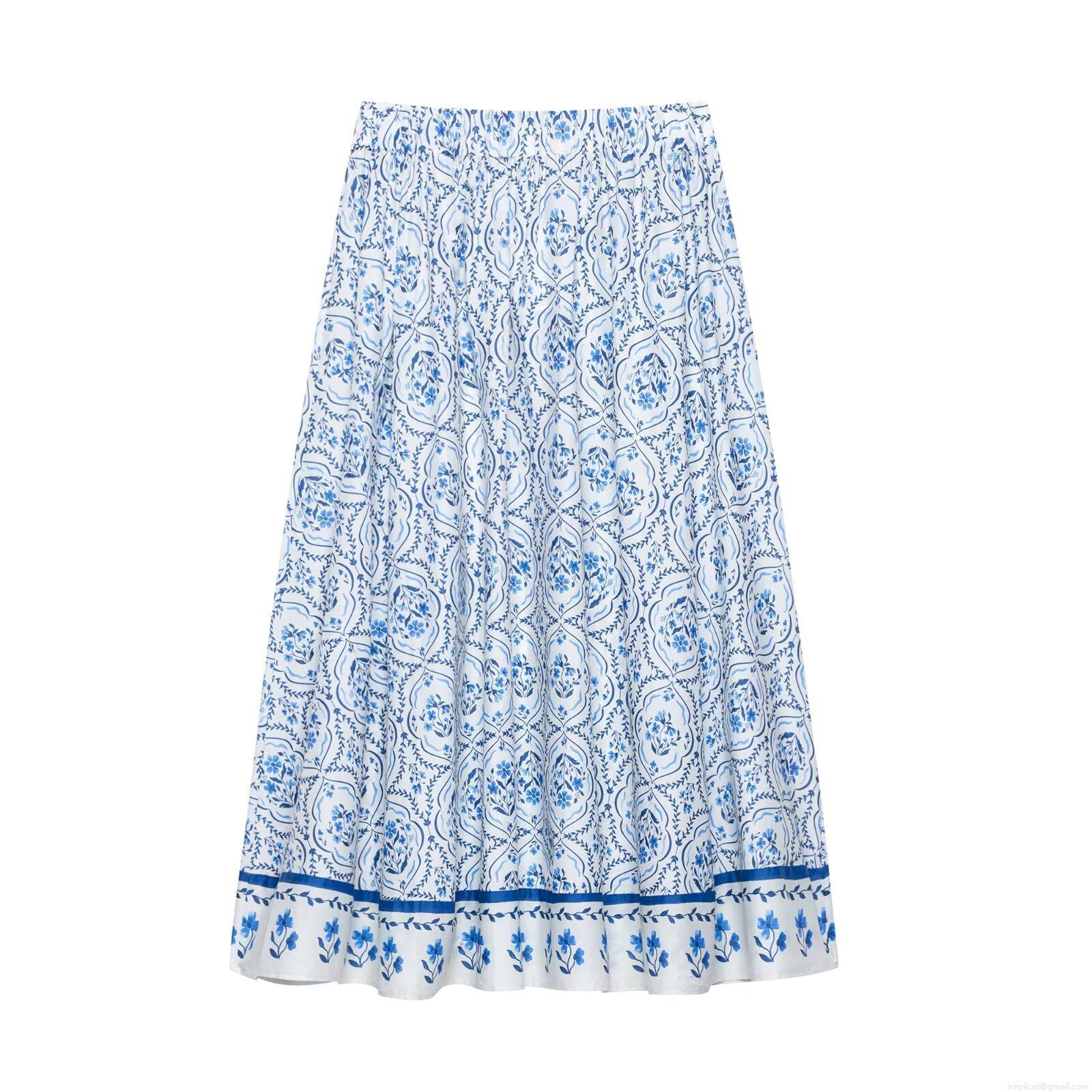 • Women's High Waist Chinoiserie Blue and White Floral Print Midi Skirt Elastic Waist A-Line Umbrella Skirt Casual Summer Vacation Flowy Long Skirt