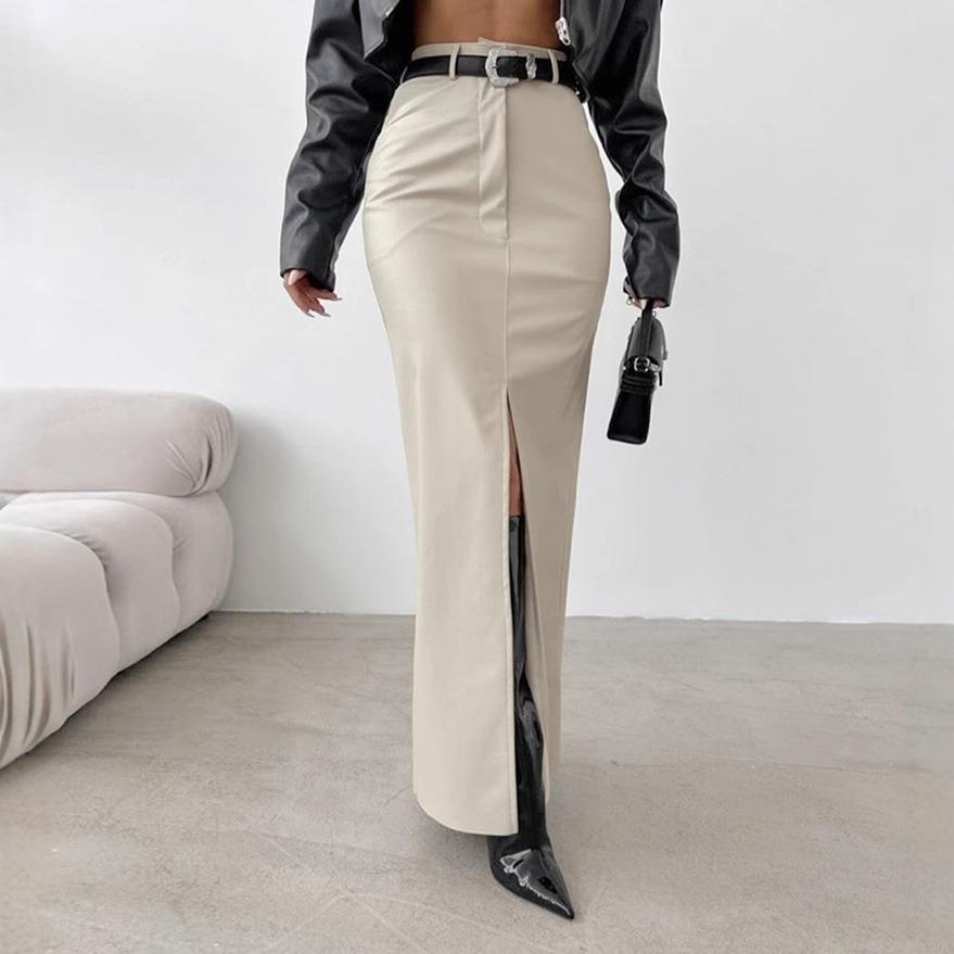 • Women's High Waist PU Leather Split Midi Skirt Minimalist Solid Color Slim Straight Long Skirt With Belt For Party Streetwear Fashionable Women