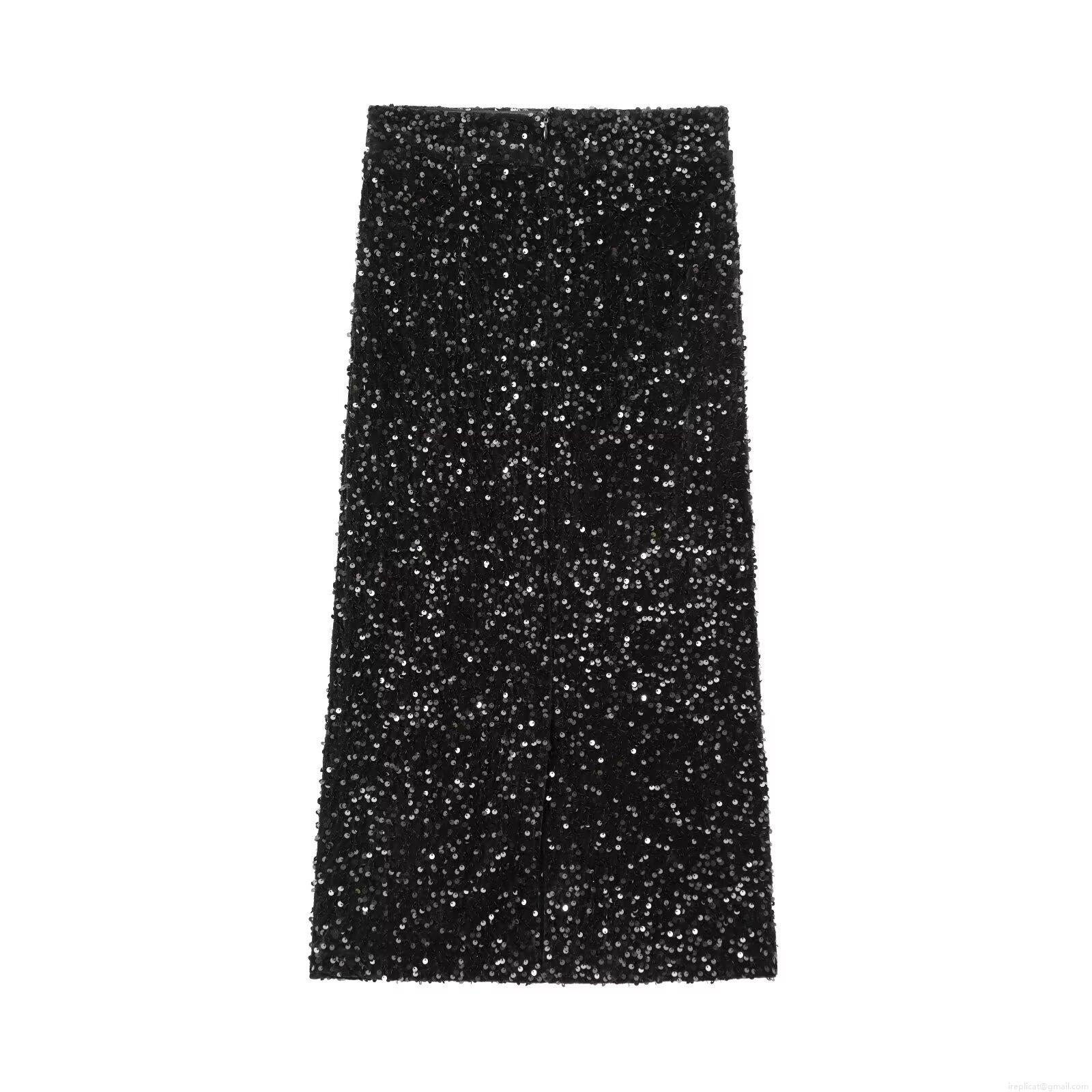 Women's High Waist Sequin Velvet Maxi Skirt Elegant Back Slit Straight Long Skirt For Party Evening Banquet Winter Fashion Street Style Black Skirts
