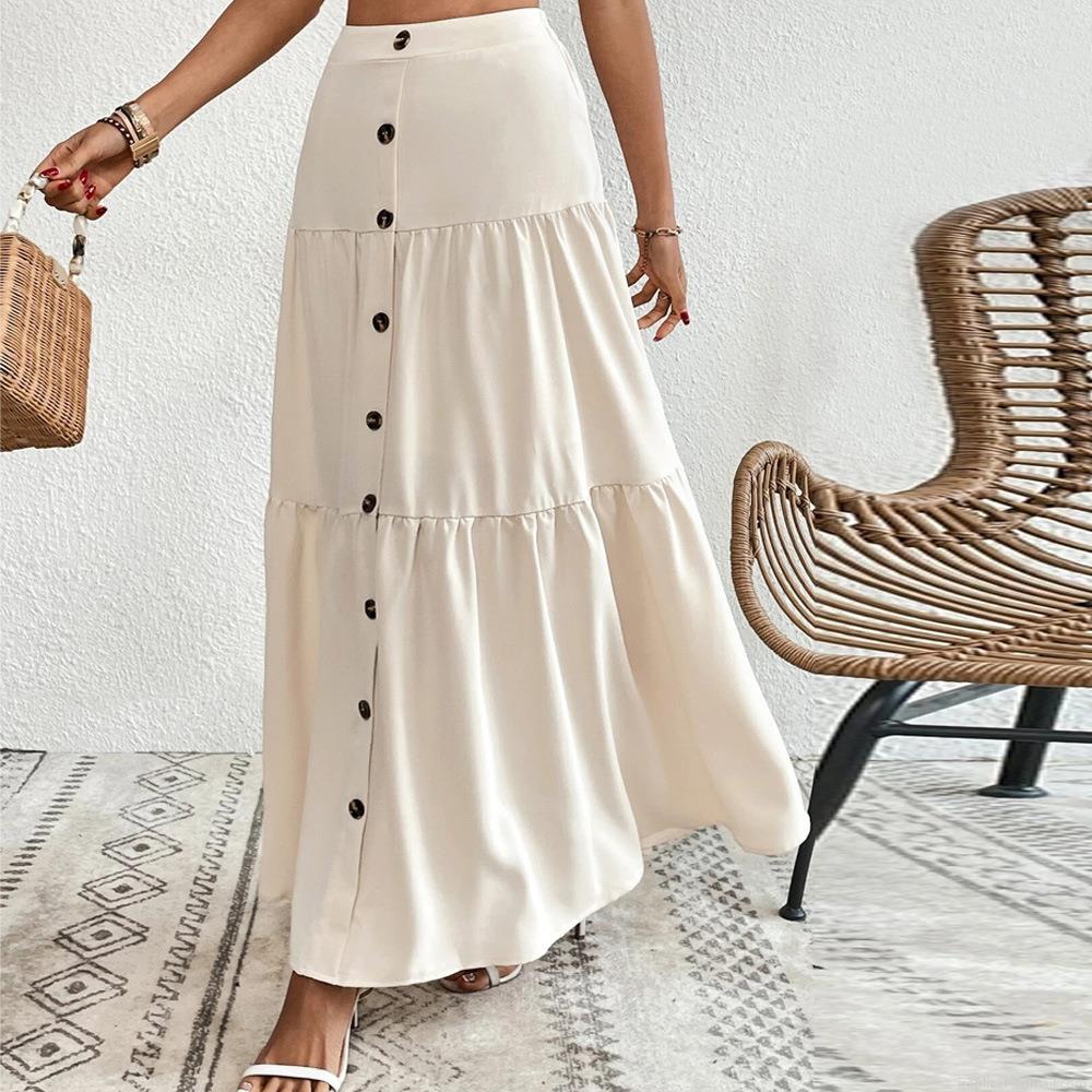 • Women's High Waist Tiered Maxi Skirt Boho Elastic Waist Layered Skirt With Decorative Front Buttons Summer Holiday Beach Skirts Women's Solid Color Casual Ruffle Long Skirts