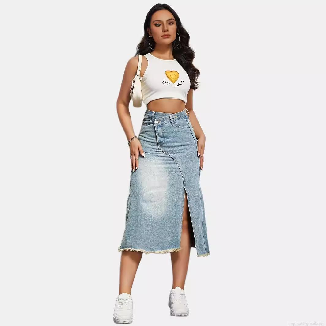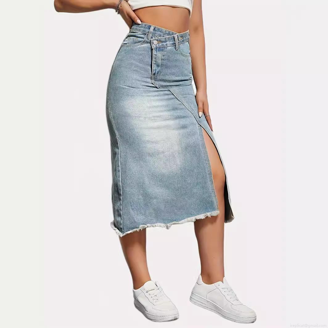 • Women's High Waisted Denim Midi Skirt Deconstructed Asymmetric Waist Cotton Denim Skirt With Slit And Raw Hem Casual Streetwear Street Style For Women