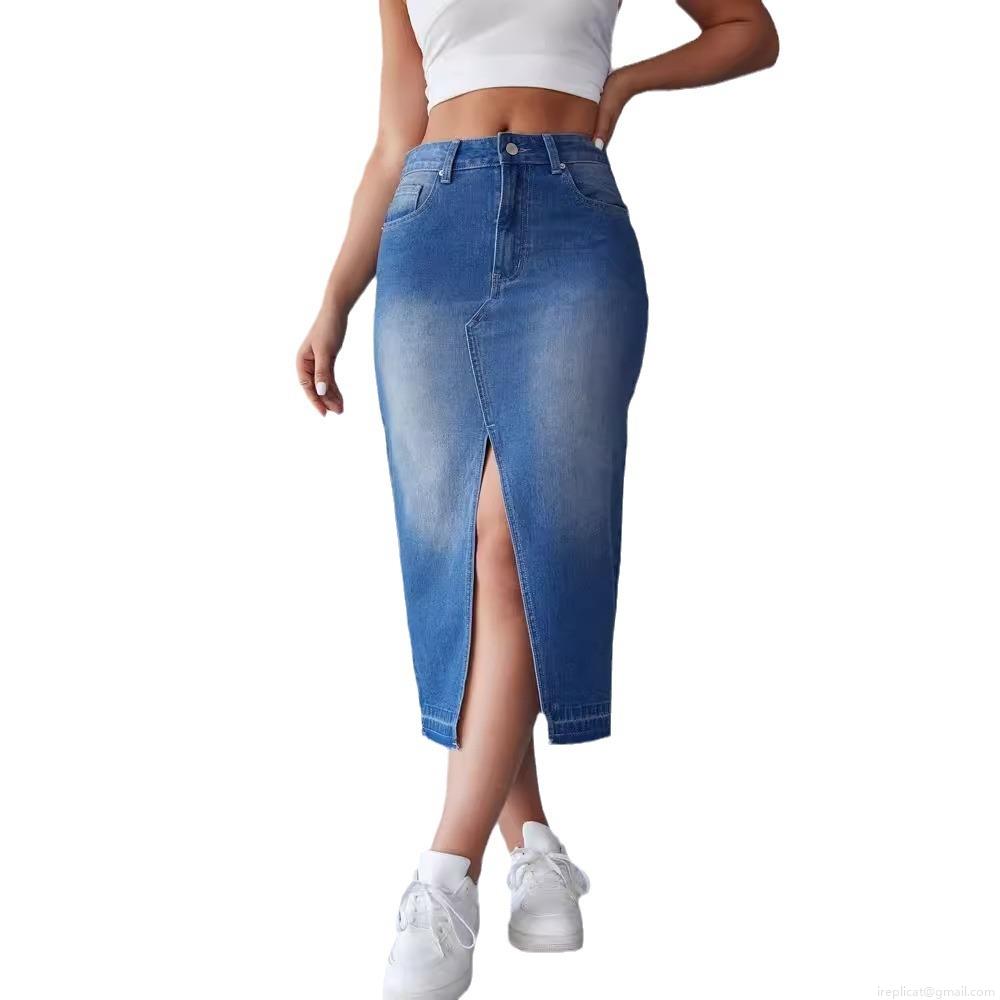 • Women's High Waisted Denim Midi Skirt With Front Slit Frayed Hem Casual Washed Blue Cotton Blend Straight Long Skirts Streetwear Fashion