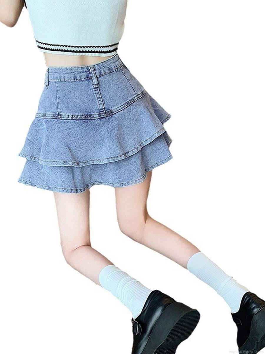 • Women's High Waisted Tiered Ruffle Denim Mini Skirt Sexy Distressed Blue Cotton Spandex Cake Skort With Safety Shorts For Summer Casual Party