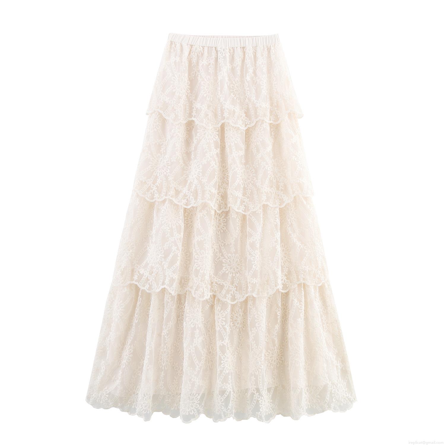 • Women's Lace Tiered Maxi Skirt Elegant Bohemian A-Line Embroidery Mesh Cake Skirt High Waist Elastic Long Skirt For Wedding Vacation