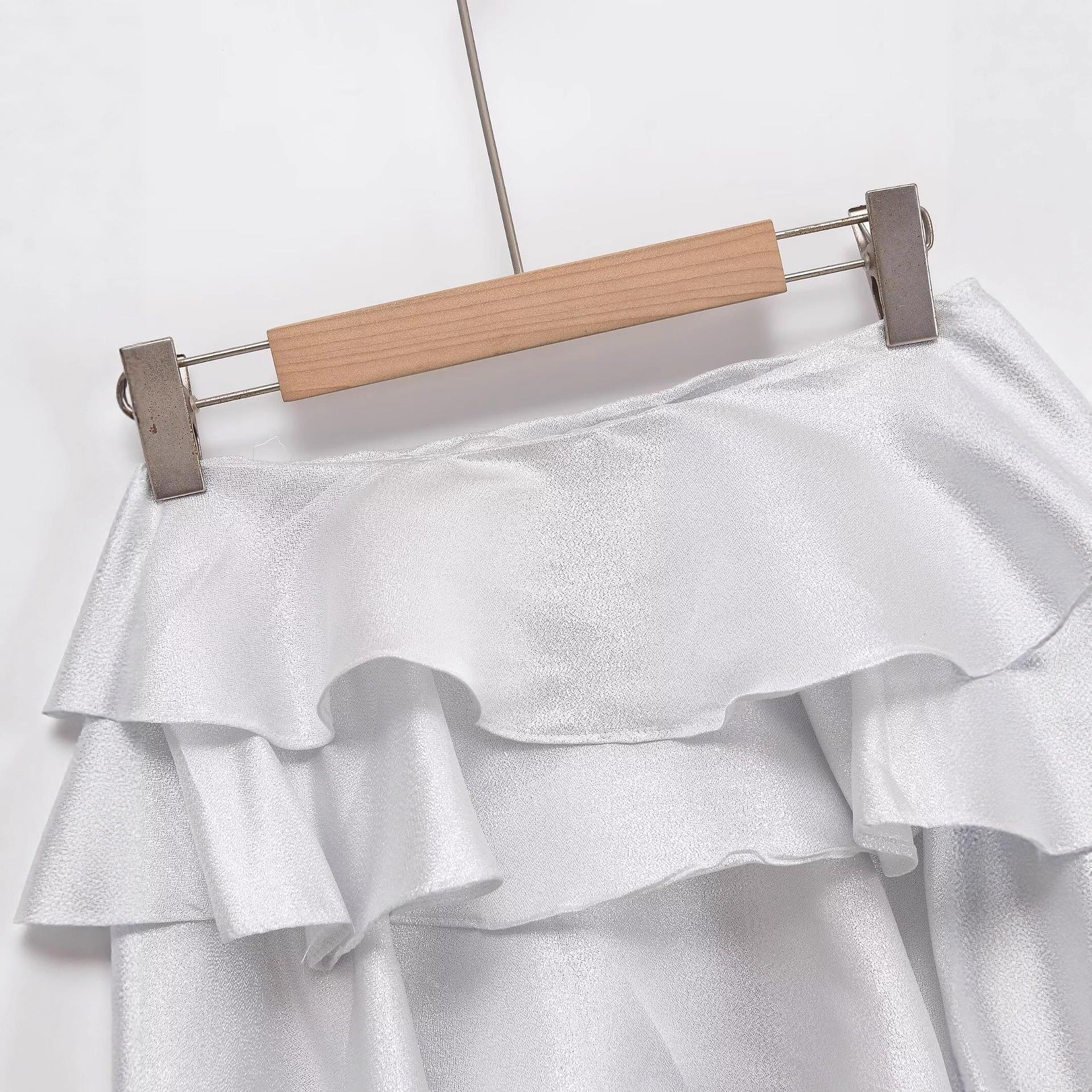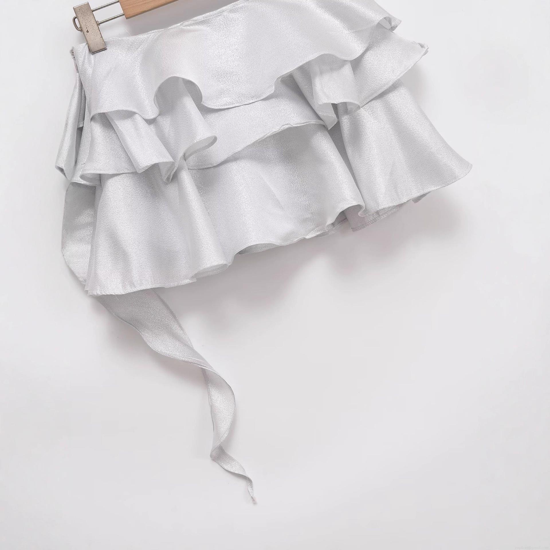 • Women's Metallic Silver Tiered Cake Skirt Glossy Ruffle Mini Skirt Western Streetwear Side Ribbon Design High Waist Fashion Short Skirts for Party