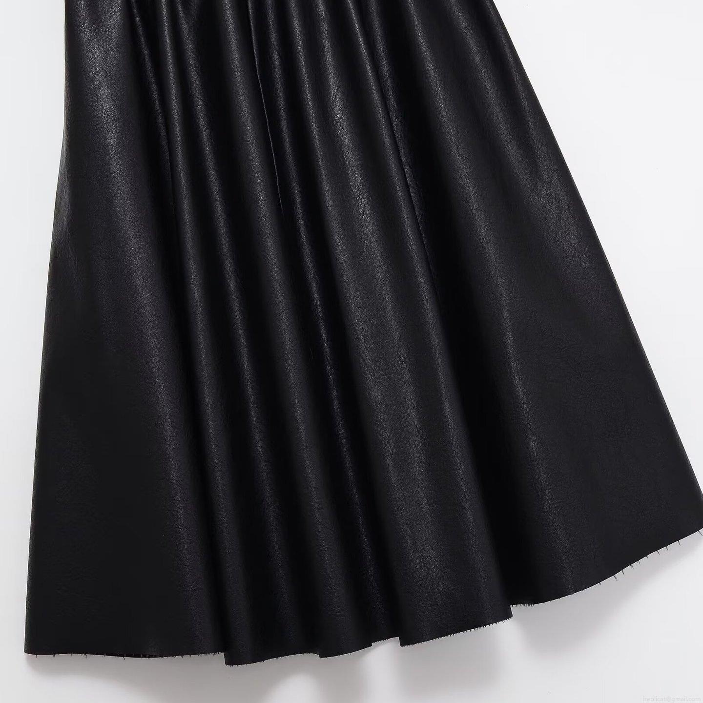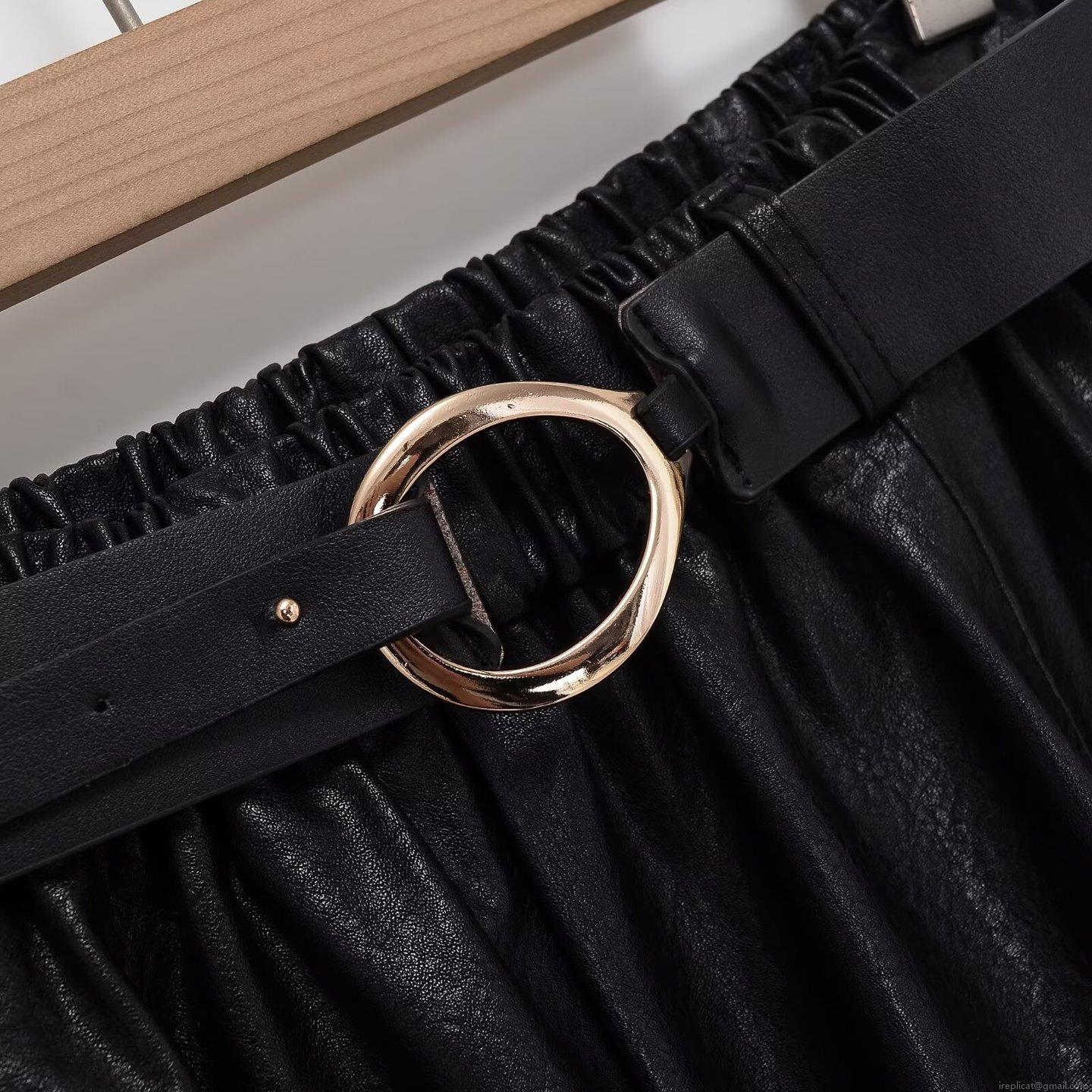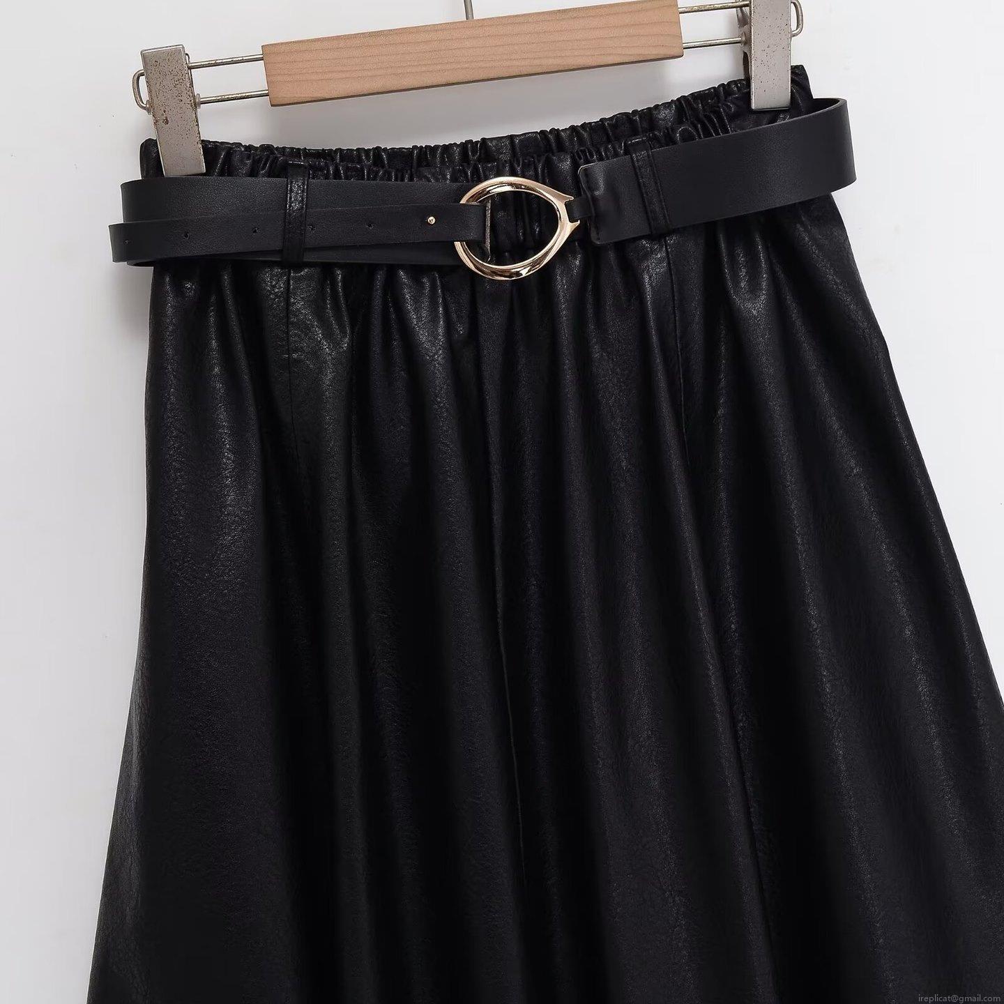 • Women's Mid-Length PU Leather Skirt High Waist Pleated A-Line Skirt With Gold Buckle Belt Elegant Commute Solid Black Faux Leather Skirt Fashion Winter Bottoms
