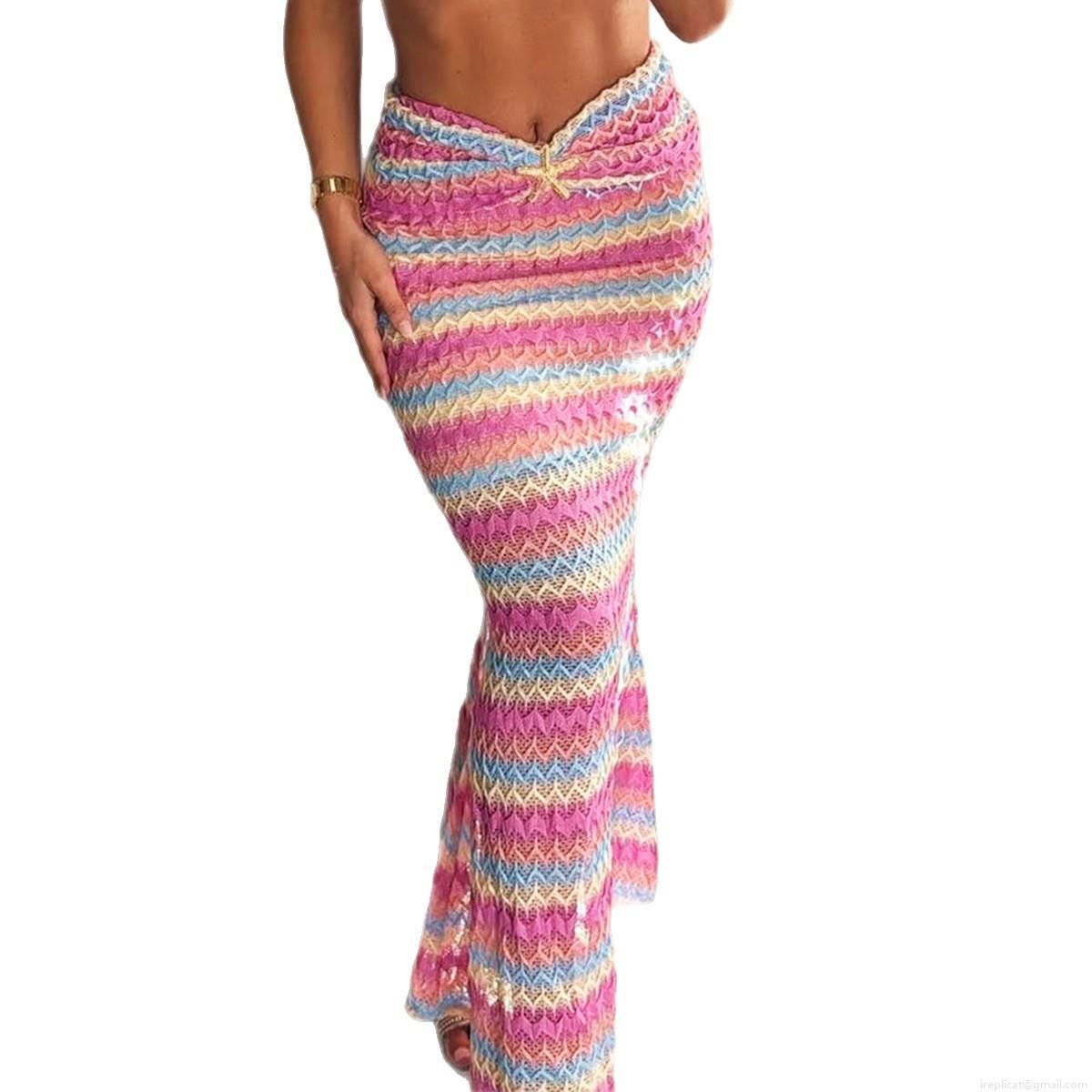 • Women's Multi-Color Striped Crochet Knit Maxi Skirt Boho Summer Beach Mermaid Skirt With Golden Starfish Charm Slim Fit Low Waist Long Skirt