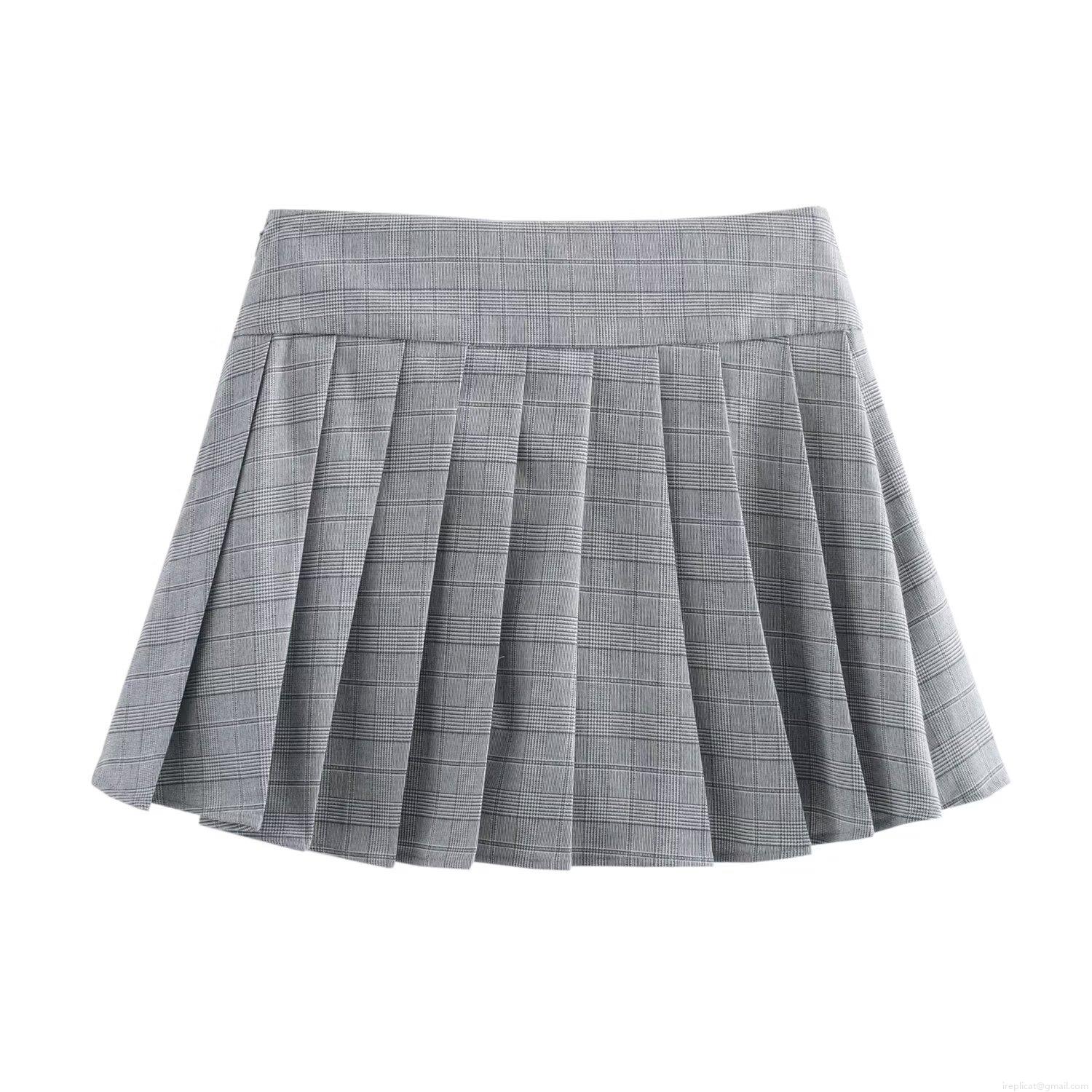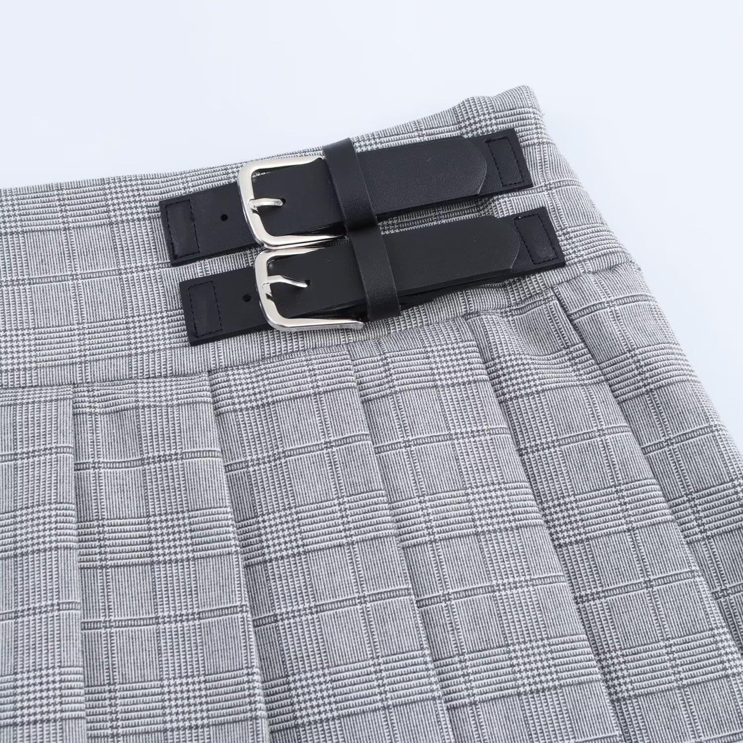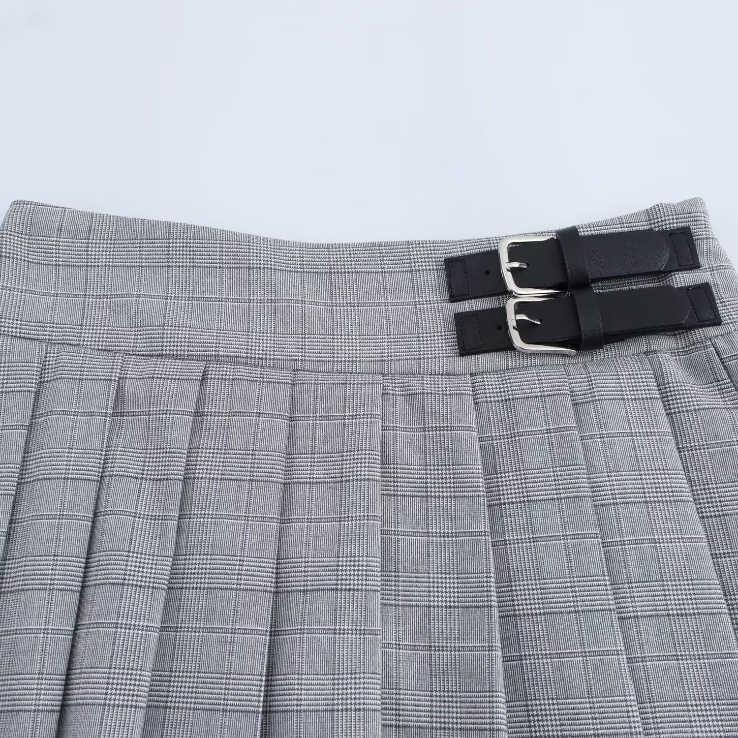 • Women's Plaid Pleated Mini Skirt With Double Faux Leather Buckles High Waist Grey Checked Short Skirt Streetwear Preppy Style Bottoms