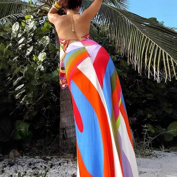 • Women's Satin Striped Maxi Skirt Colorful Geometric Print High Waisted Slim Fit Hip Hugging Long Skirt for Beach Resort Vacation Elegant Bohemian Skirts