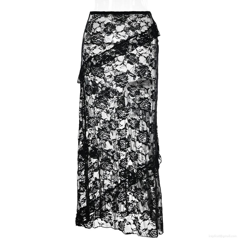 • Women's Sexy Lace Sheer Maxi Skirt With Ruffles Y2K Floral Splicing High Waist Transparent Long Skirt For Party Club Streetwear
