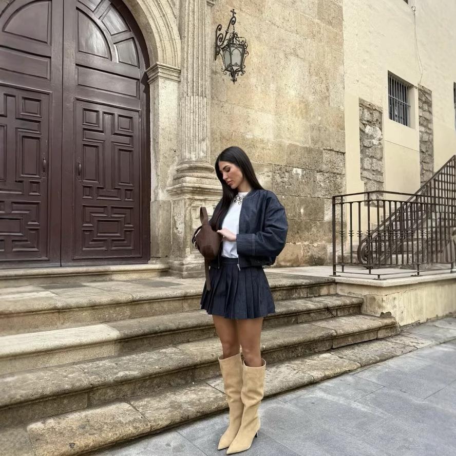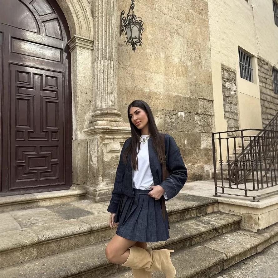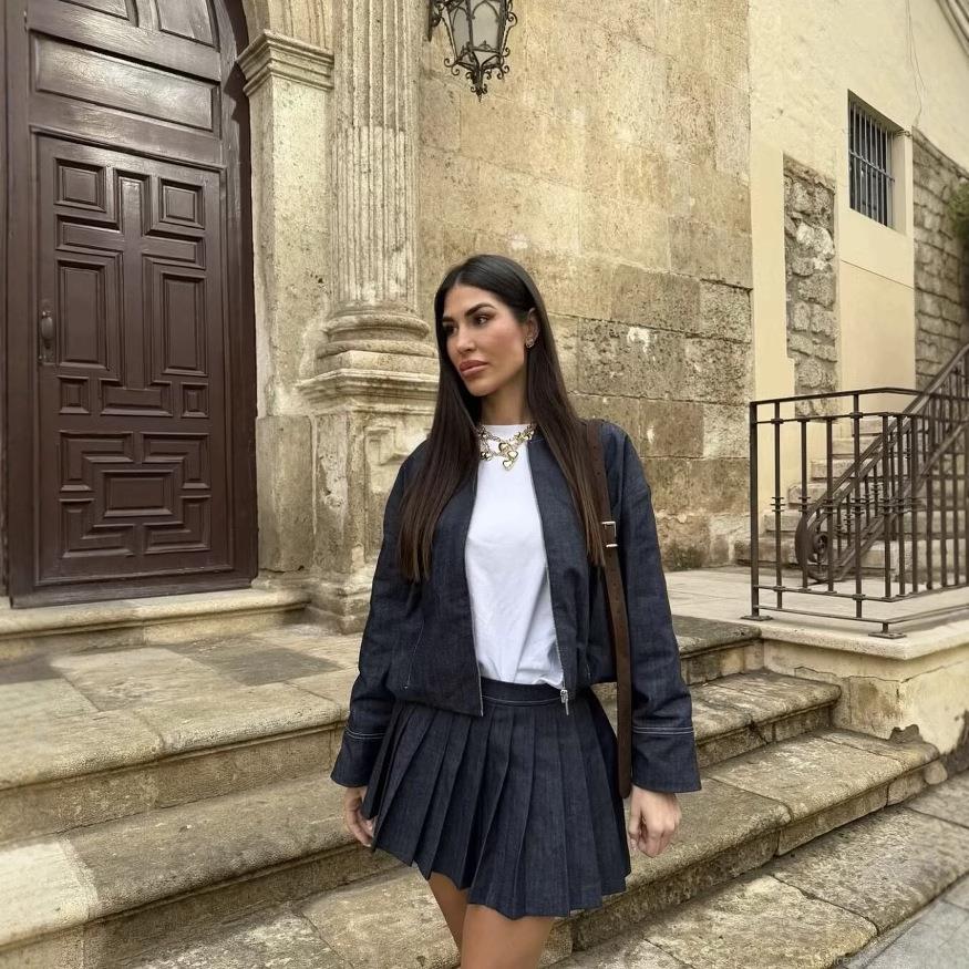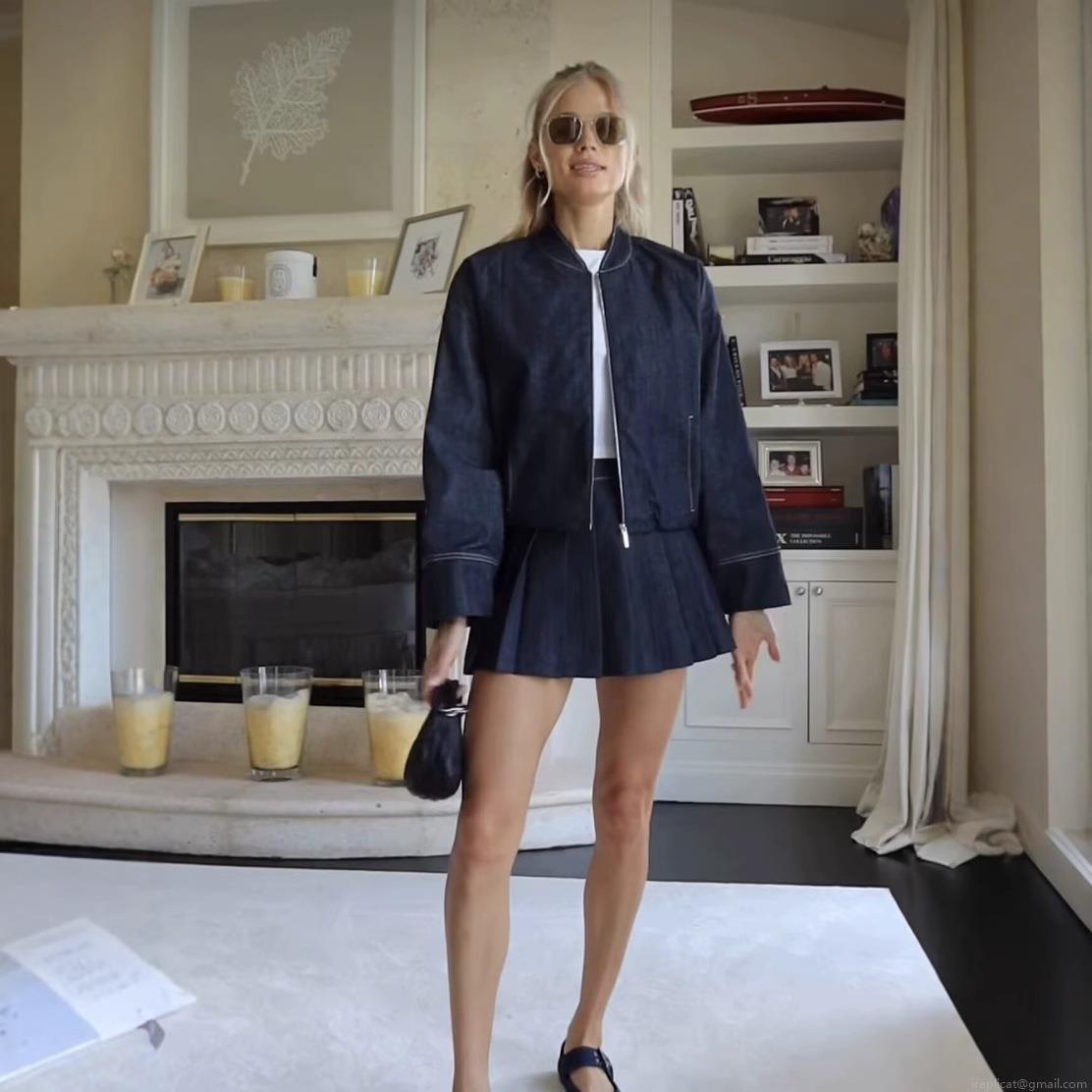 • Women's Sexy Pleated Denim Mini Skirt Mid Waist Solid Navy Blue Polyester Skirt with Zipper and Stitching Detail for Daily Casual Streetwear Date Party Summer Y2K Girls