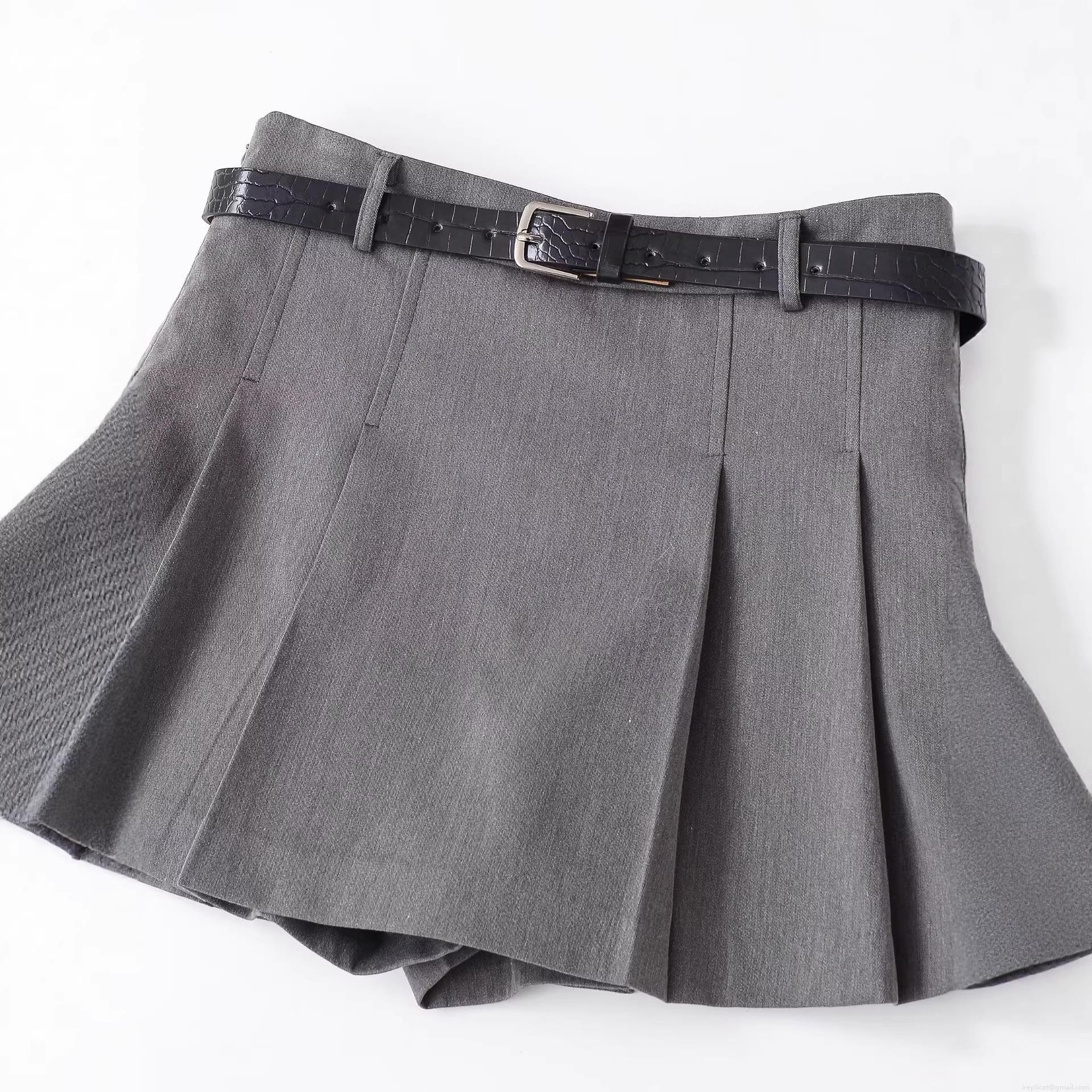 • Women's Sexy Pleated Mini Skort With Black Crocodile Texture Belt High Waist A-Line Solid Grey Polyester Short Skirt For Streetwear Party Date