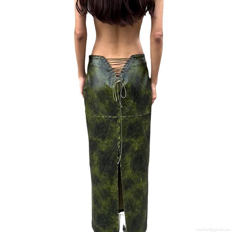 • Women's Sexy PU Leather Midi Skirt Vintage Distressed Marble Print Back Lace-up Slit Pencil Skirt High Waist Streetwear Clubwear Bodycon Skirt