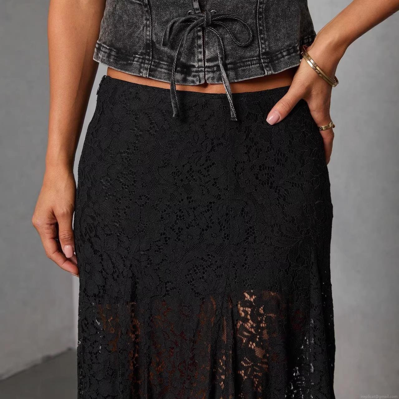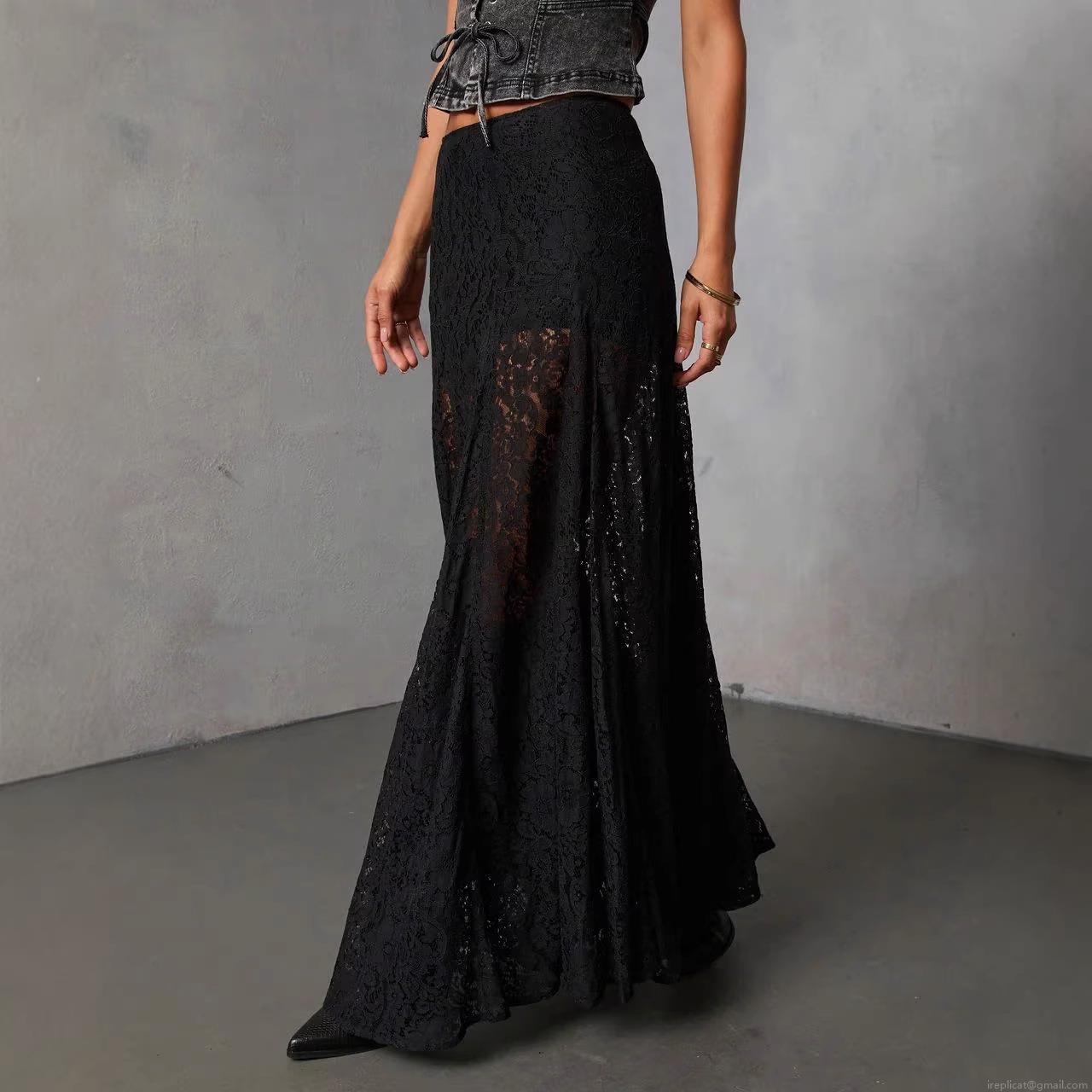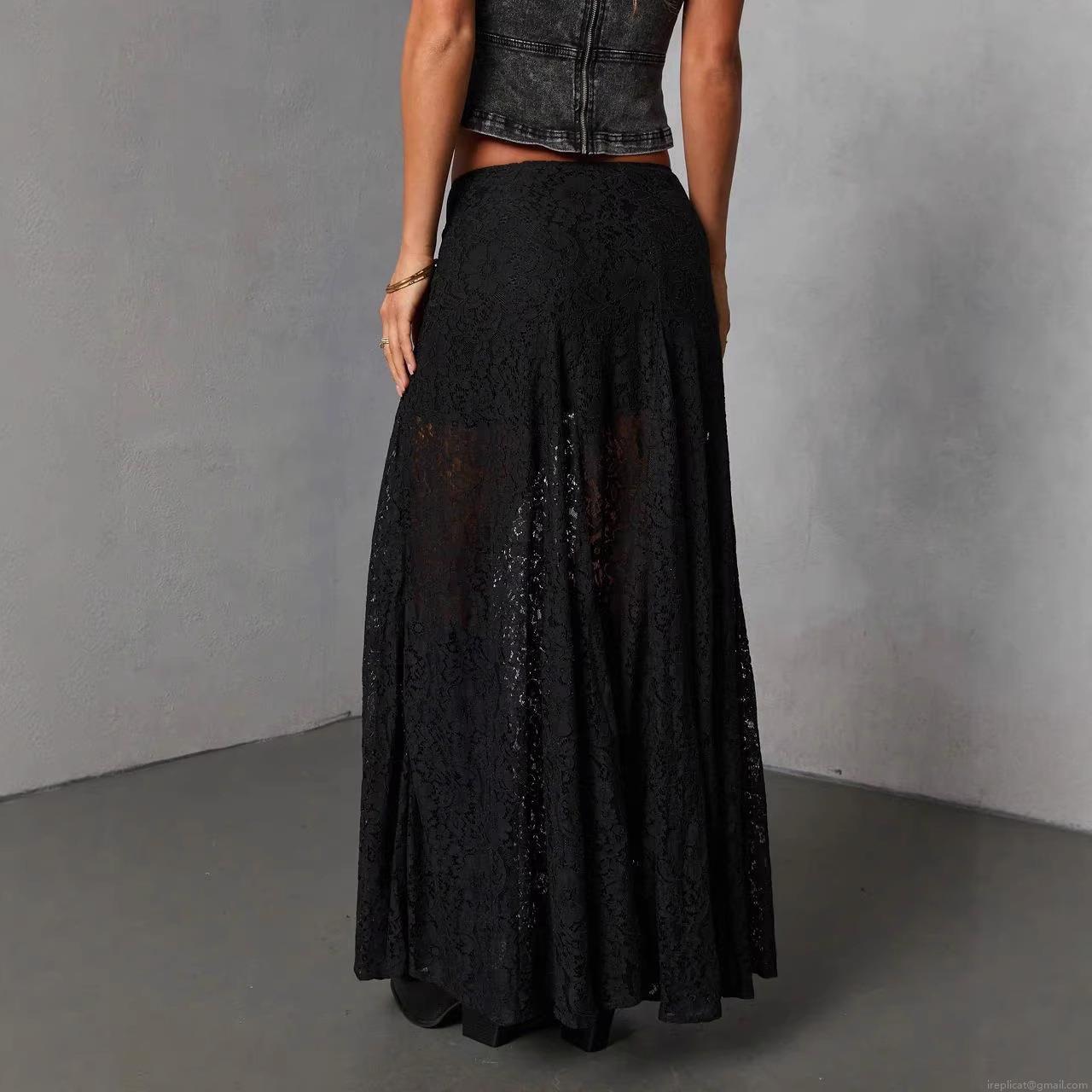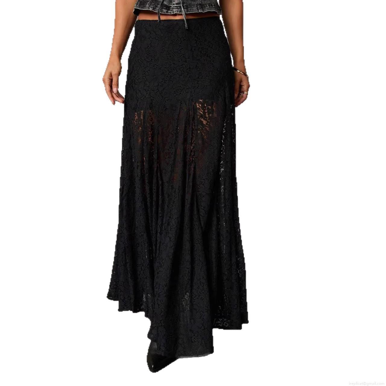 • Women's Sexy Retro Black Polyester Lace Maxi Skirt High Slit See-through A-Line Long Skirt For Streetwear Party Summer