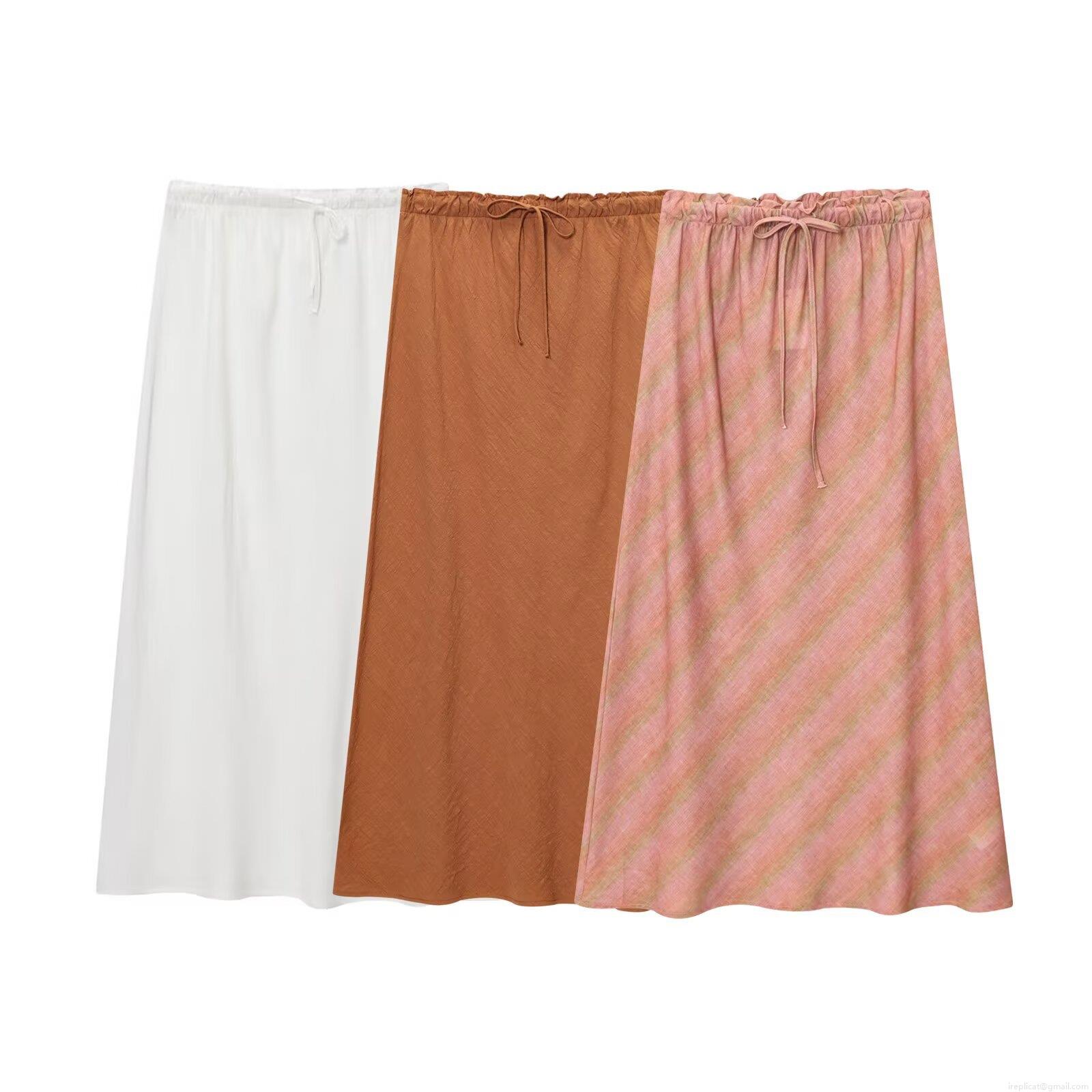 • Women's Slub Polyester Linen Midi Skirt Elastic Waist Drawstring A-Line Solid Color Striped Summer Vacation Skirts For Women Streetwear Casual Bottoms
