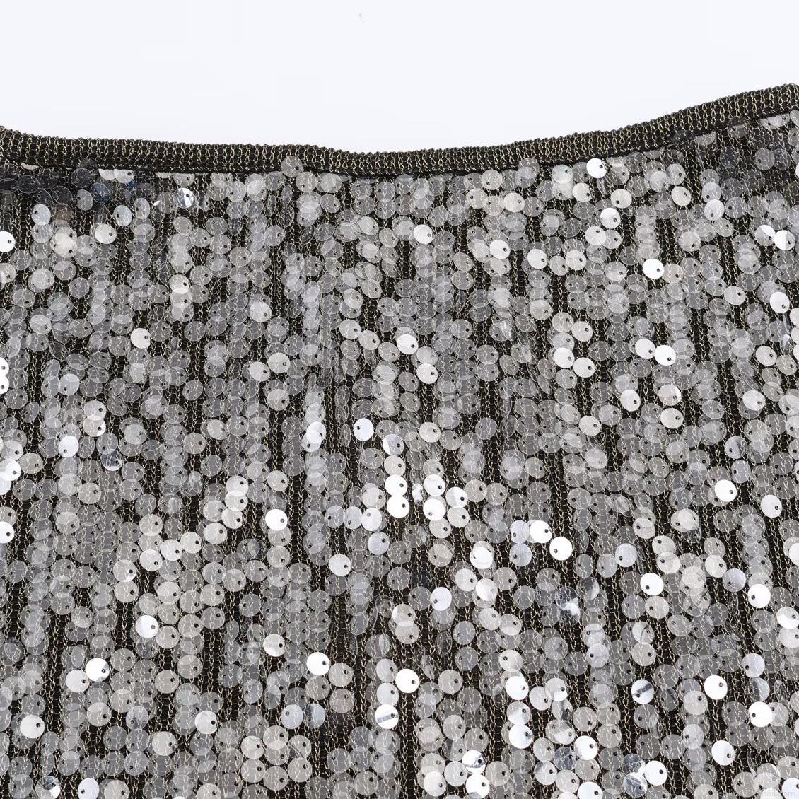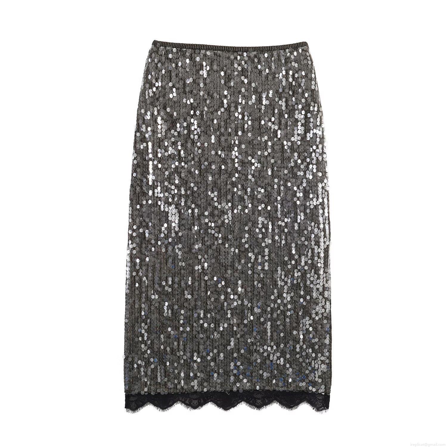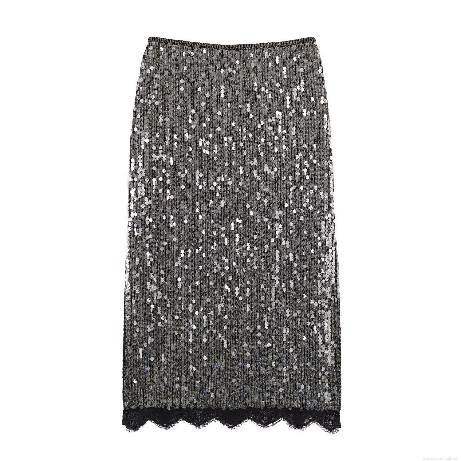 • Women's Sparkling Silver Sequin Skirt With Black Lace Hem Patchwork Sexy Bodycon Straight Maxi Skirt For Party Nightclub Evening Clubwear Elegant Lady Style Bottoms