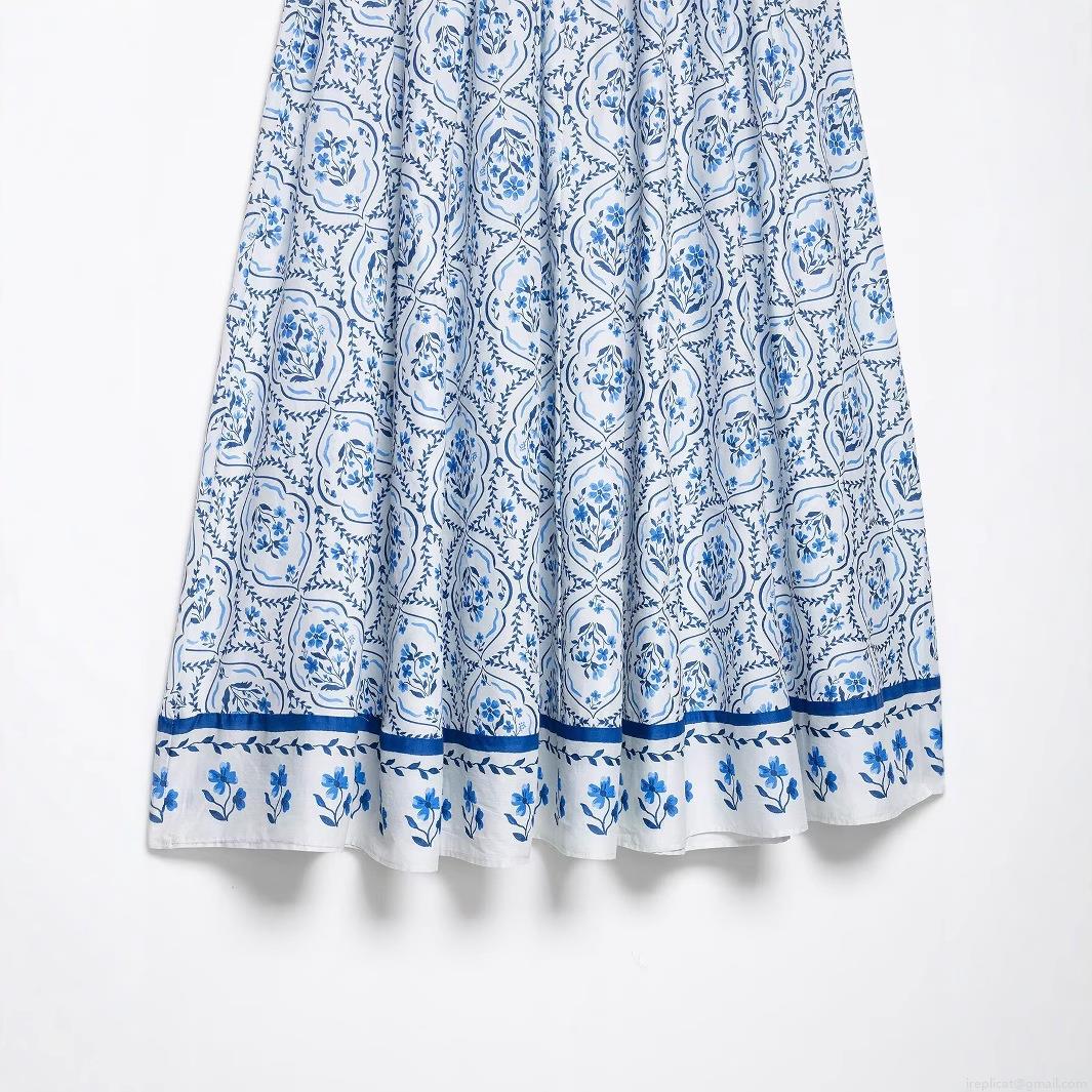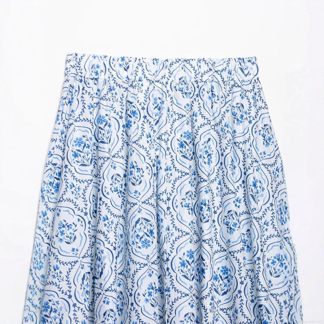 Women's Vintage Blue And White Floral Print A-Line Long Skirt 100% Polyester Woven Fabric Elastic High Waist Flowy Bohemian Summer Beach Maxi Skirt For Women