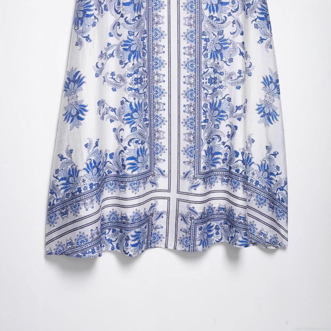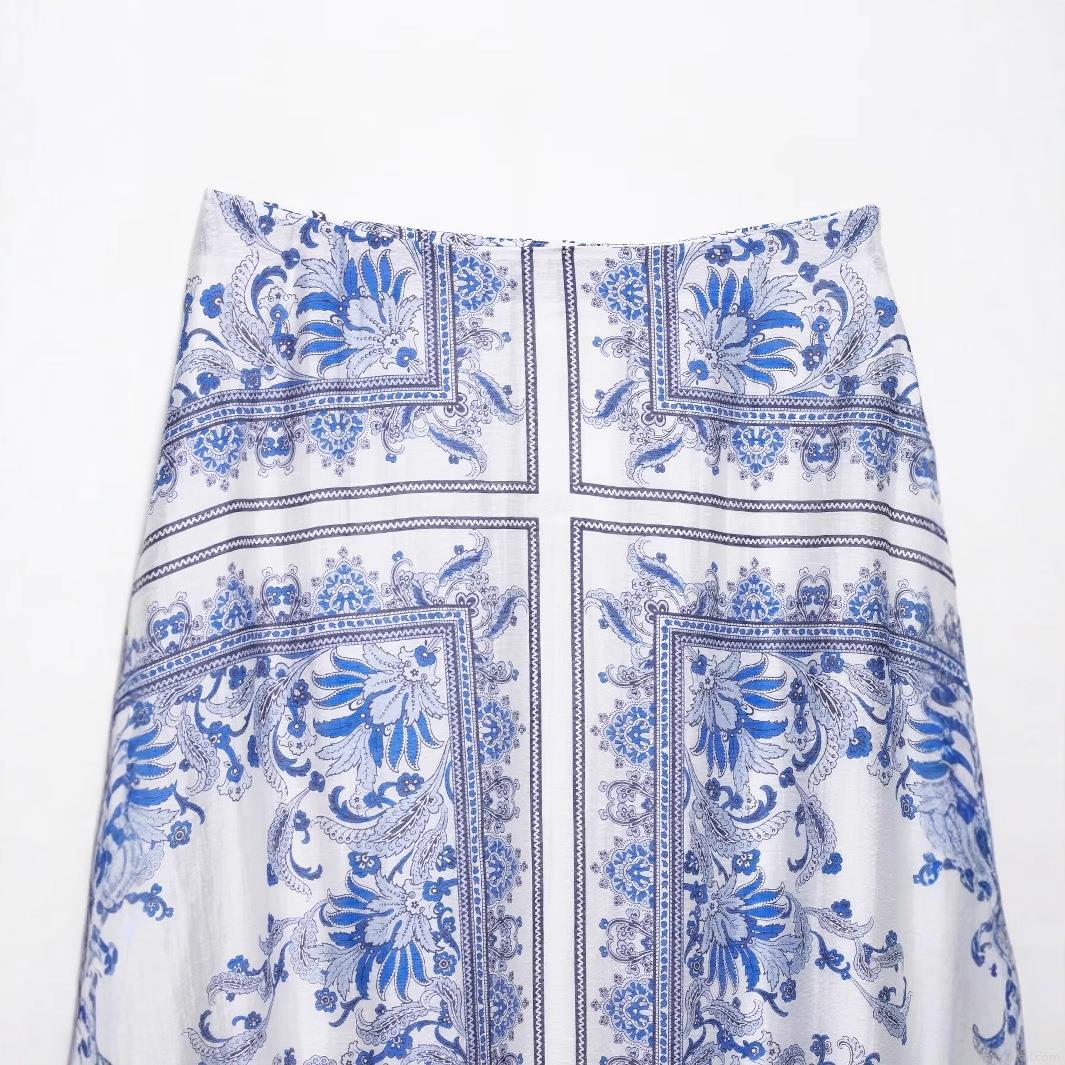• Women's Vintage Blue and White Porcelain Print Maxi Skirt High Waist Satin Polyester Long A-Line Swing Skirts for Vacation Party Holiday Streetwear