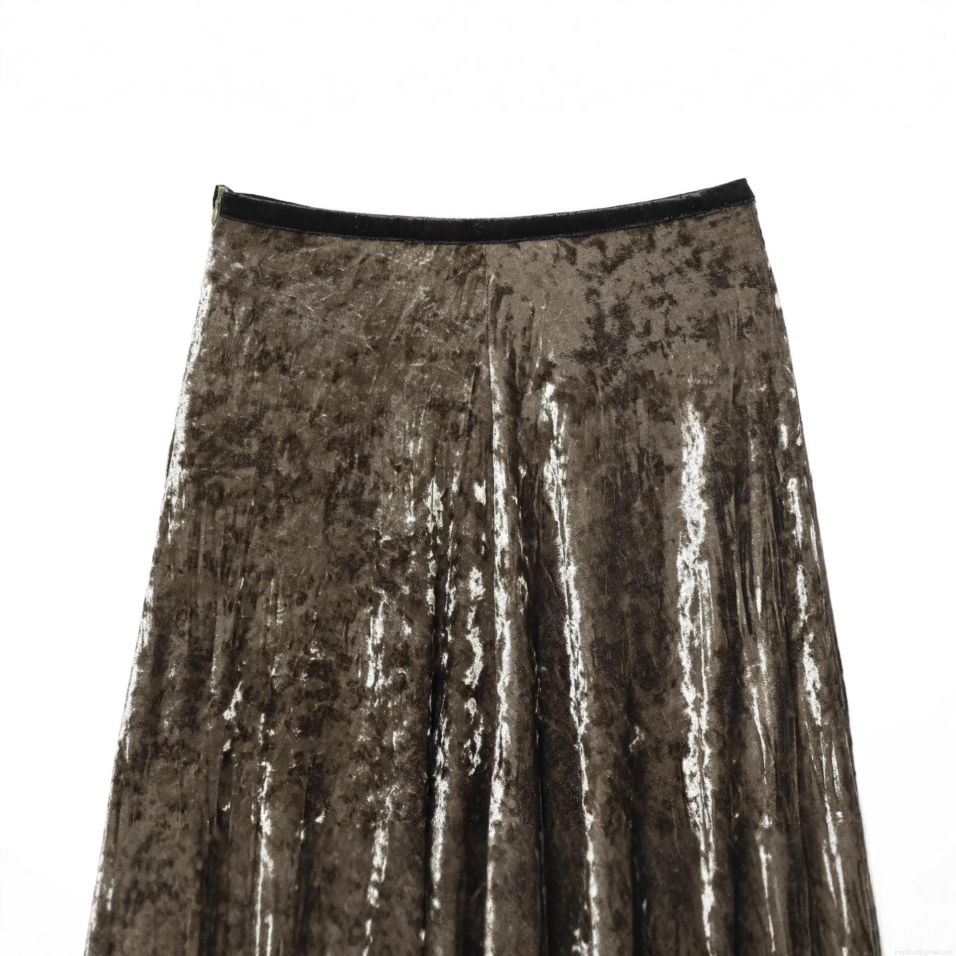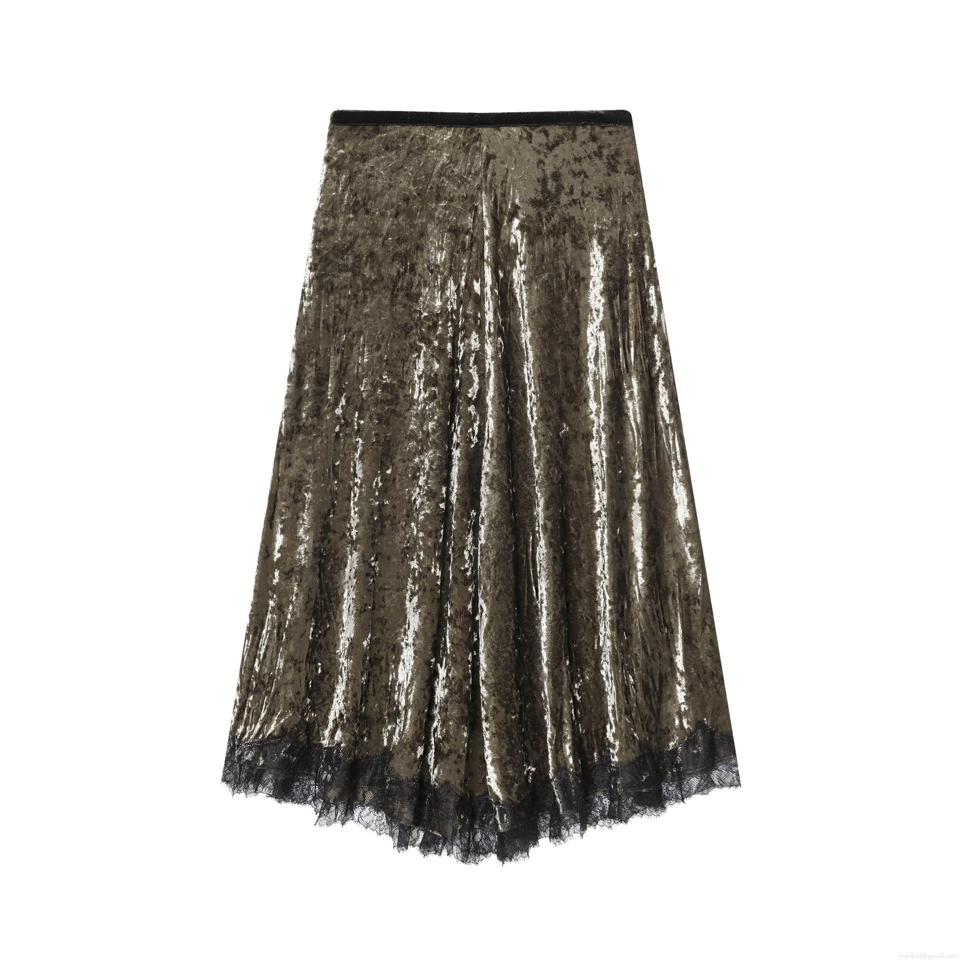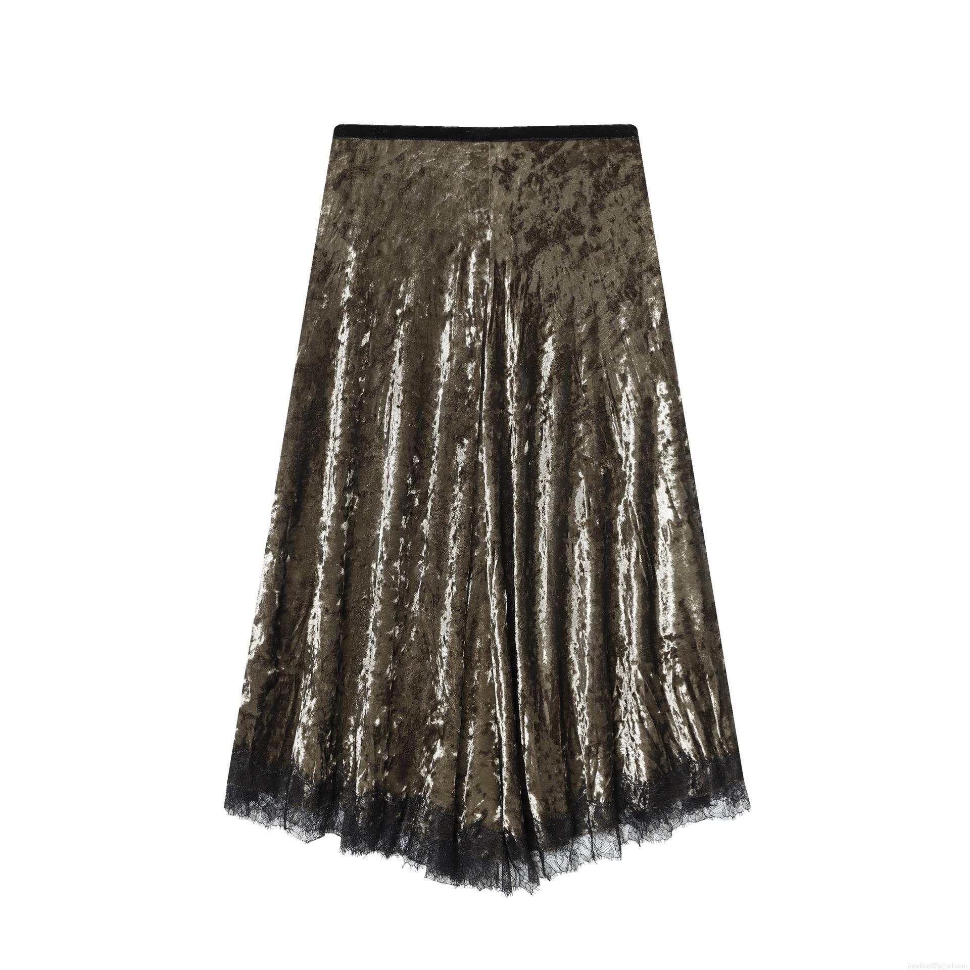 Women's Vintage Bronze Crushed Velvet Skirt With Black Lace Hem Sexy High Waist Midi Straight Polyester Skirt For Party Clubwear