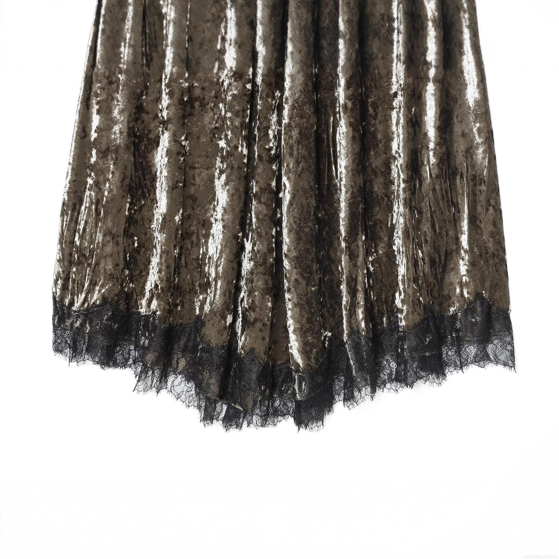 • Women's Vintage Bronze Crushed Velvet Skirt With Black Lace Hem Sexy High Waist Midi Straight Polyester Skirt For Party Clubwear