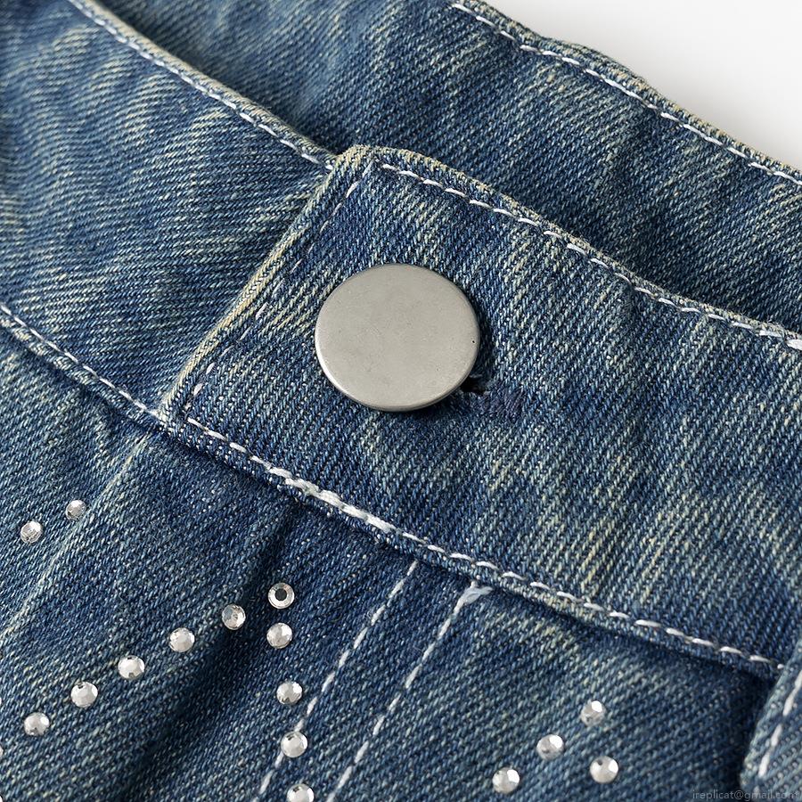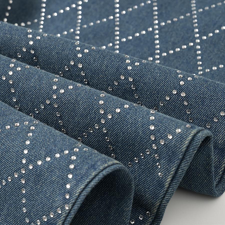 Women's Straight Leg Jeans Rhinestone Rhombus Pattern Denim Pants High Waist Split Hem Casual Streetwear Navy Blue Trousers For Ladies