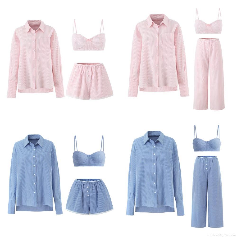 • Women's Striped 3 Piece Loungewear Set Cotton Blend Long Sleeve Button Down Shirt Camisole Tank Top Lace Trim Shorts Casual Summer Home Pajamas Outfit