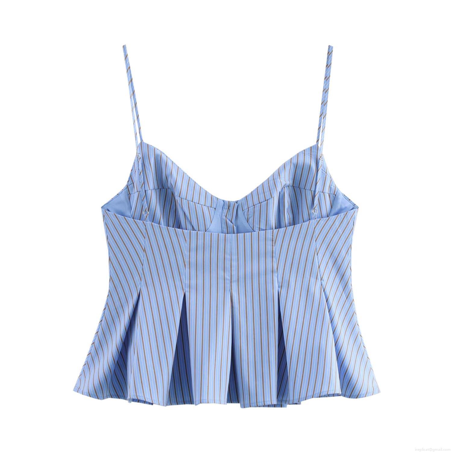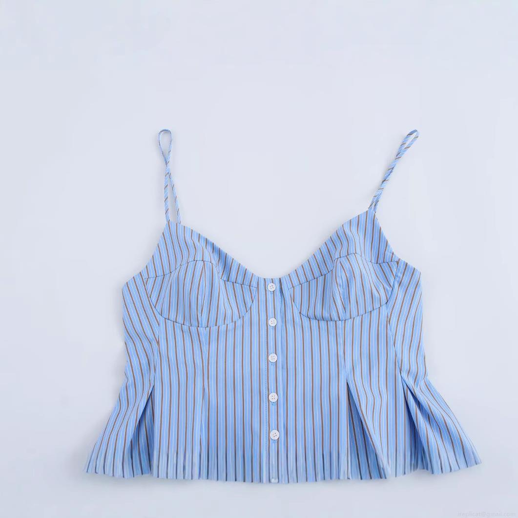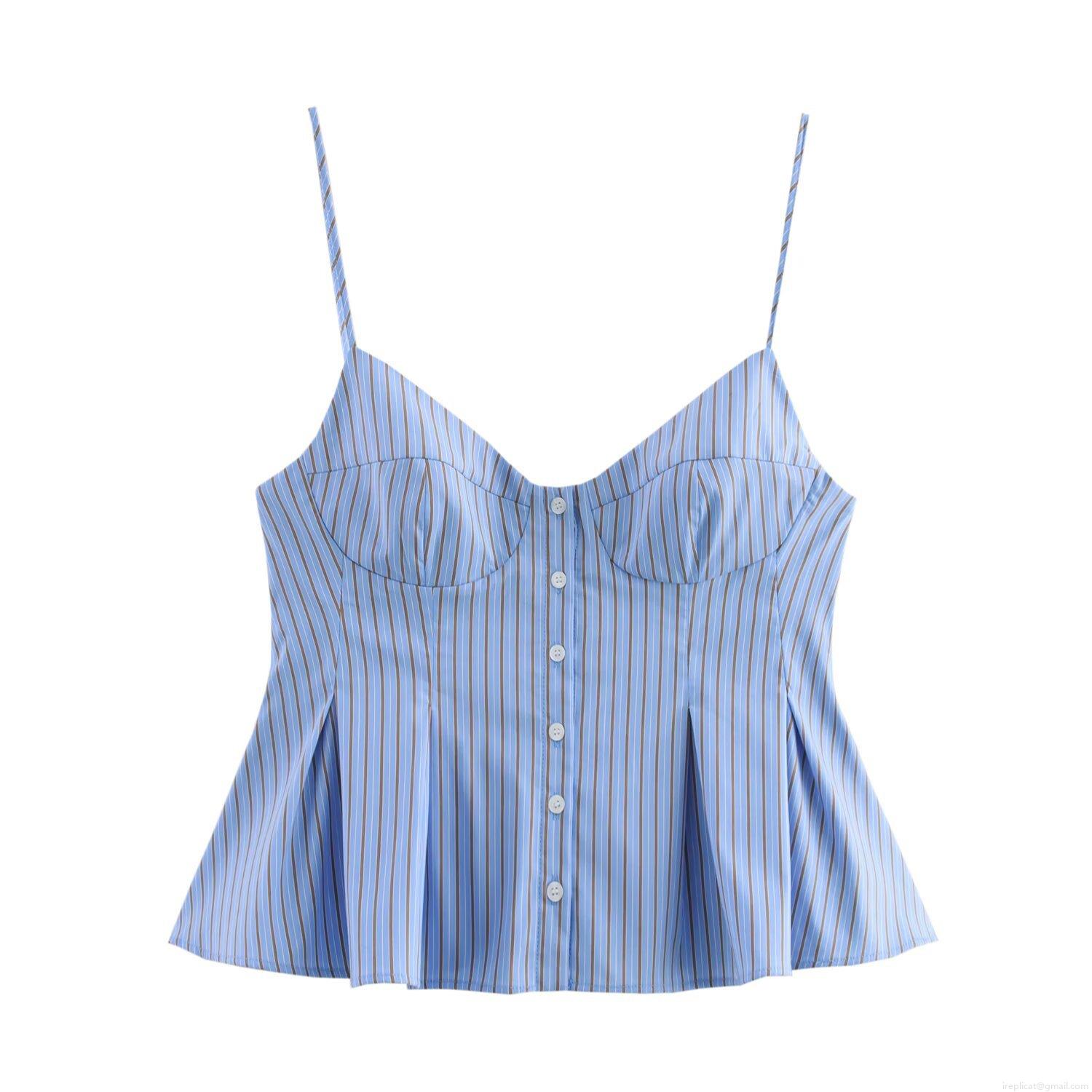 • Women's Striped Spaghetti Strap Cami Top With Front Buttons V Neck Pleated Peplum Hem Slim Fit Poplin Streetwear Summer Blue Brown Sleeveless Tank Top