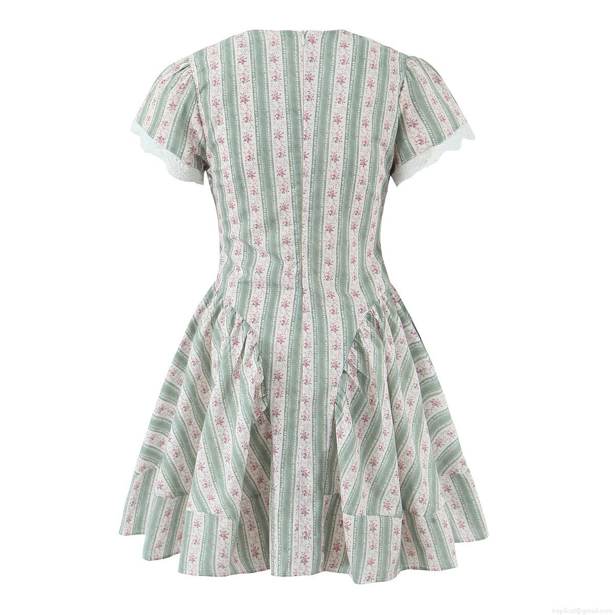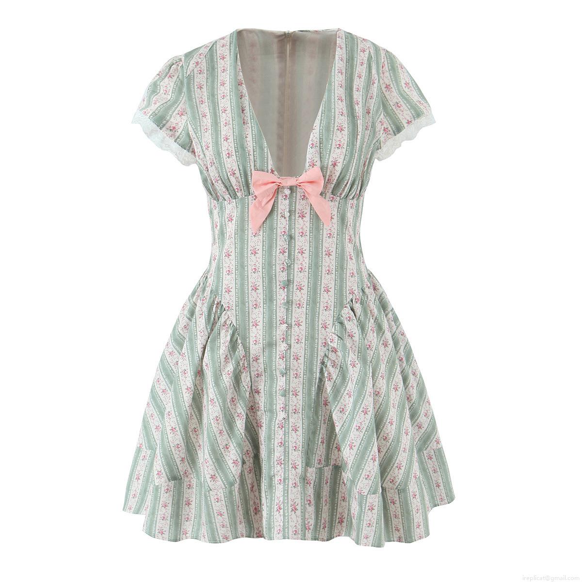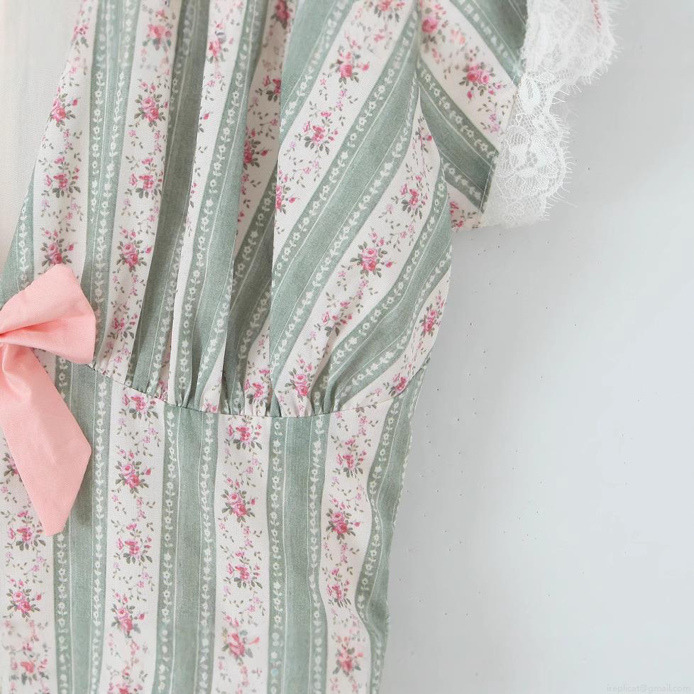 • Women's Summer V-Neck Puff Sleeve Bow Floral Striped Cotton Blend Dress Sweet Slim Fit Short Sleeve Lace Trim Cottagecore Mini Dress Holiday Party A-Line Sun Dress