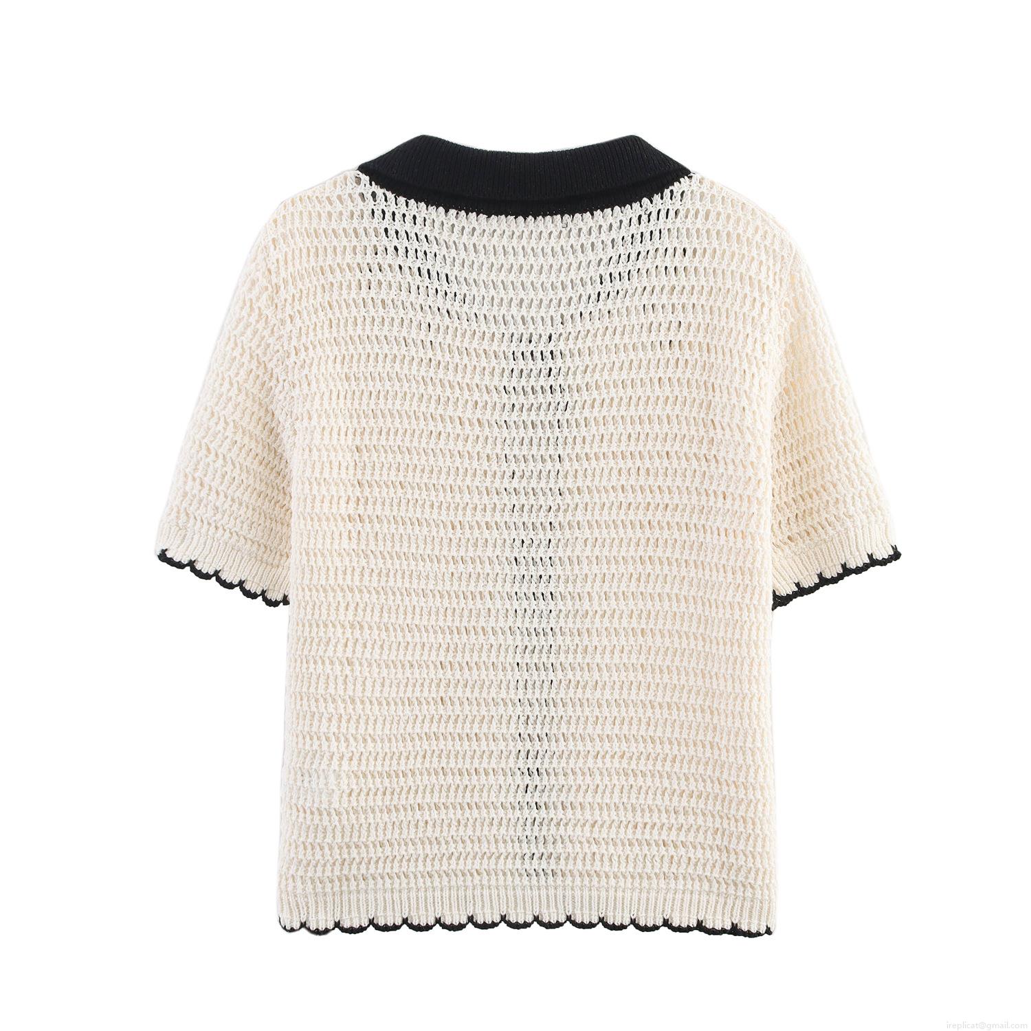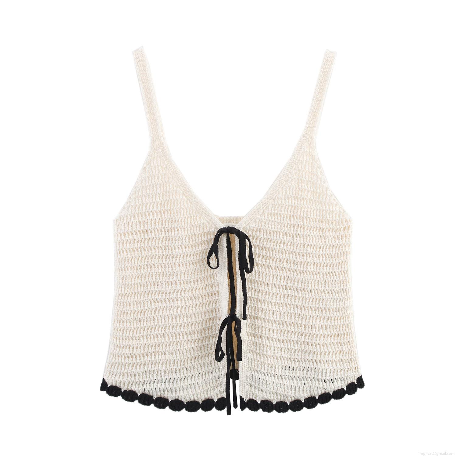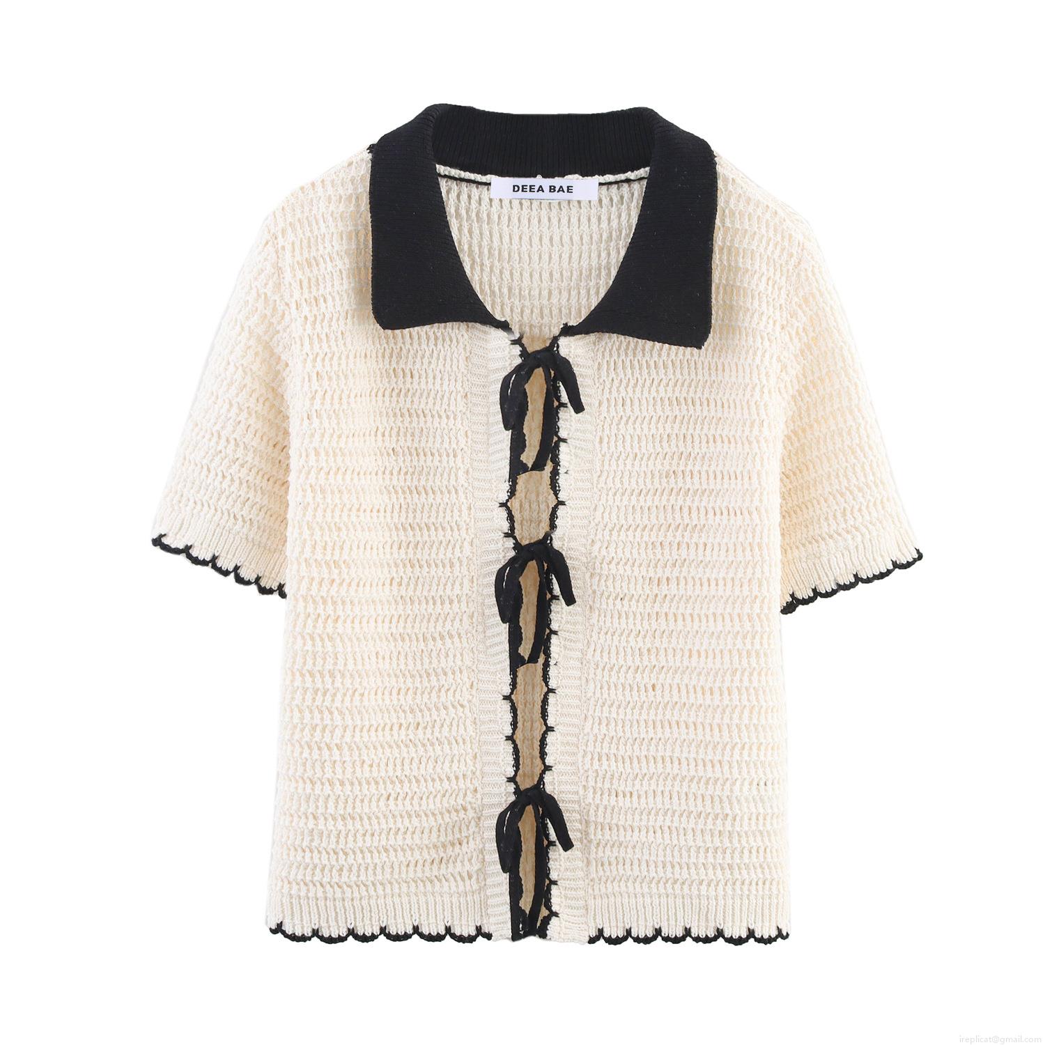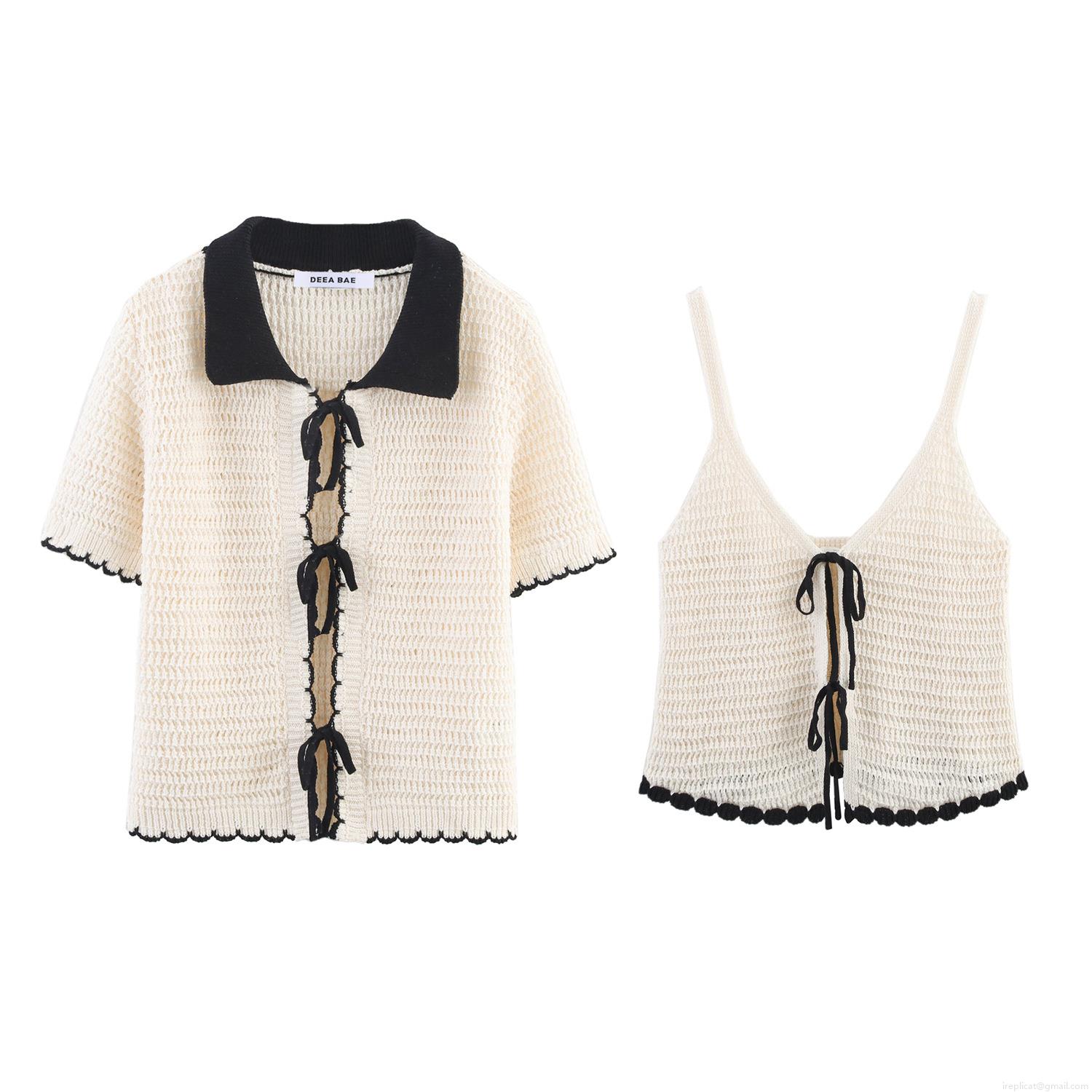 • Women 2-Piece Knit Sweater Set - Contrast Trim Crochet Bow Cardigan And Cami Top - Short Sleeve V-Neck Streetwear Spring Summer Outfits