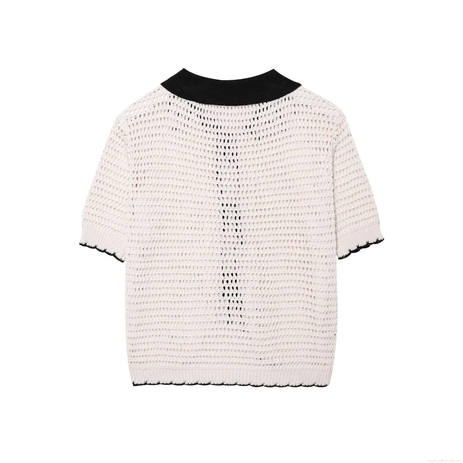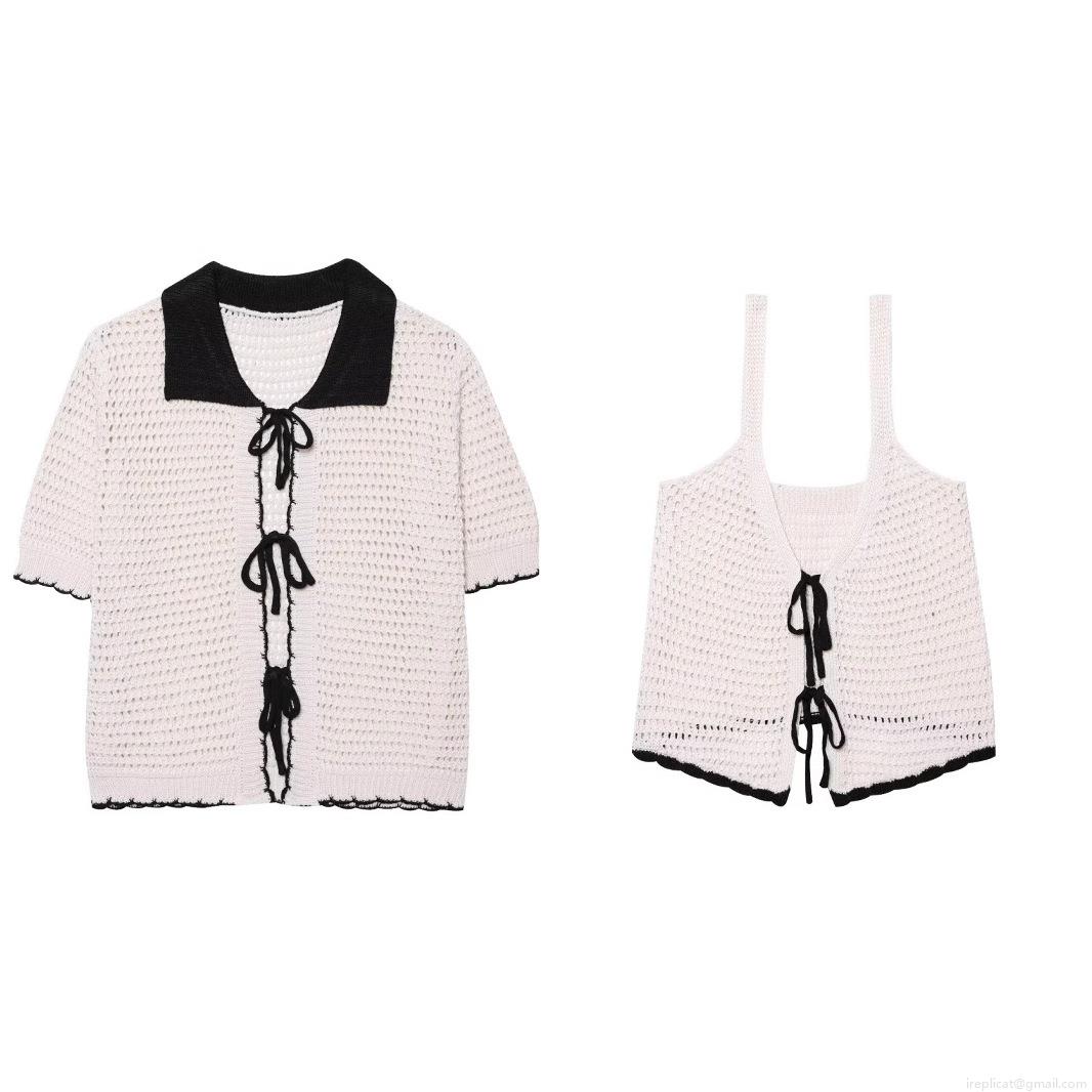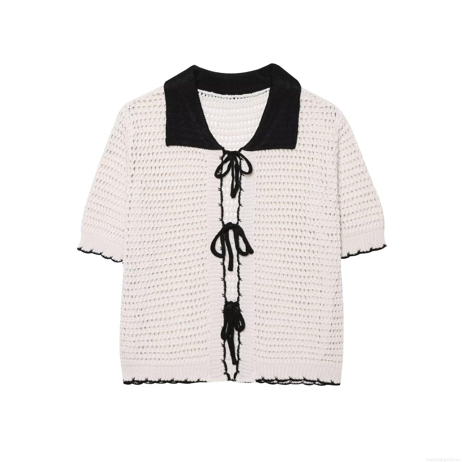 • Women's 2-Piece Knit Set Contrast Color Hollow Out Short Sleeve Cardigan And Camisole Top With Bow Ties Sexy Streetwear Crochet Outfits For Summer