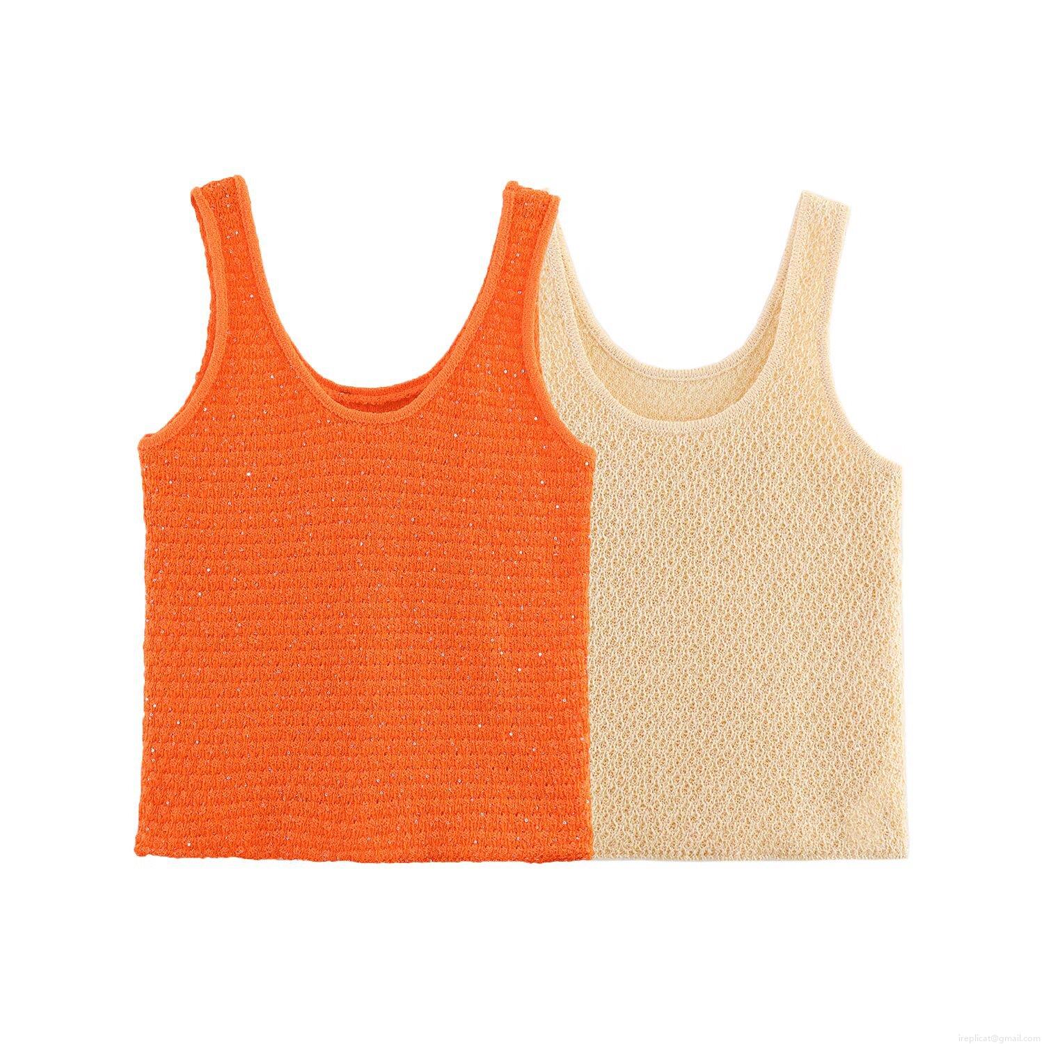 Women's Knitted Two Piece Set Sparkling Sequin Mesh Cutout Short Sleeve Cardigan And Round Neck Vest Tops For Autumn Streetwear Fashion