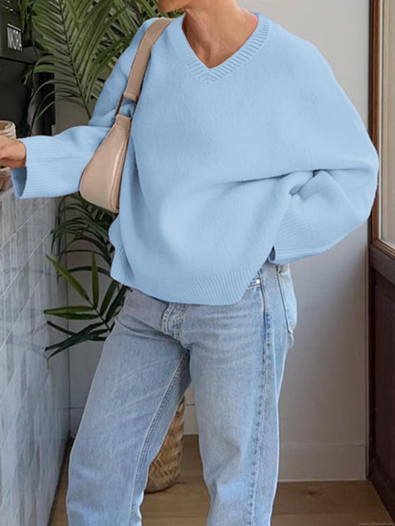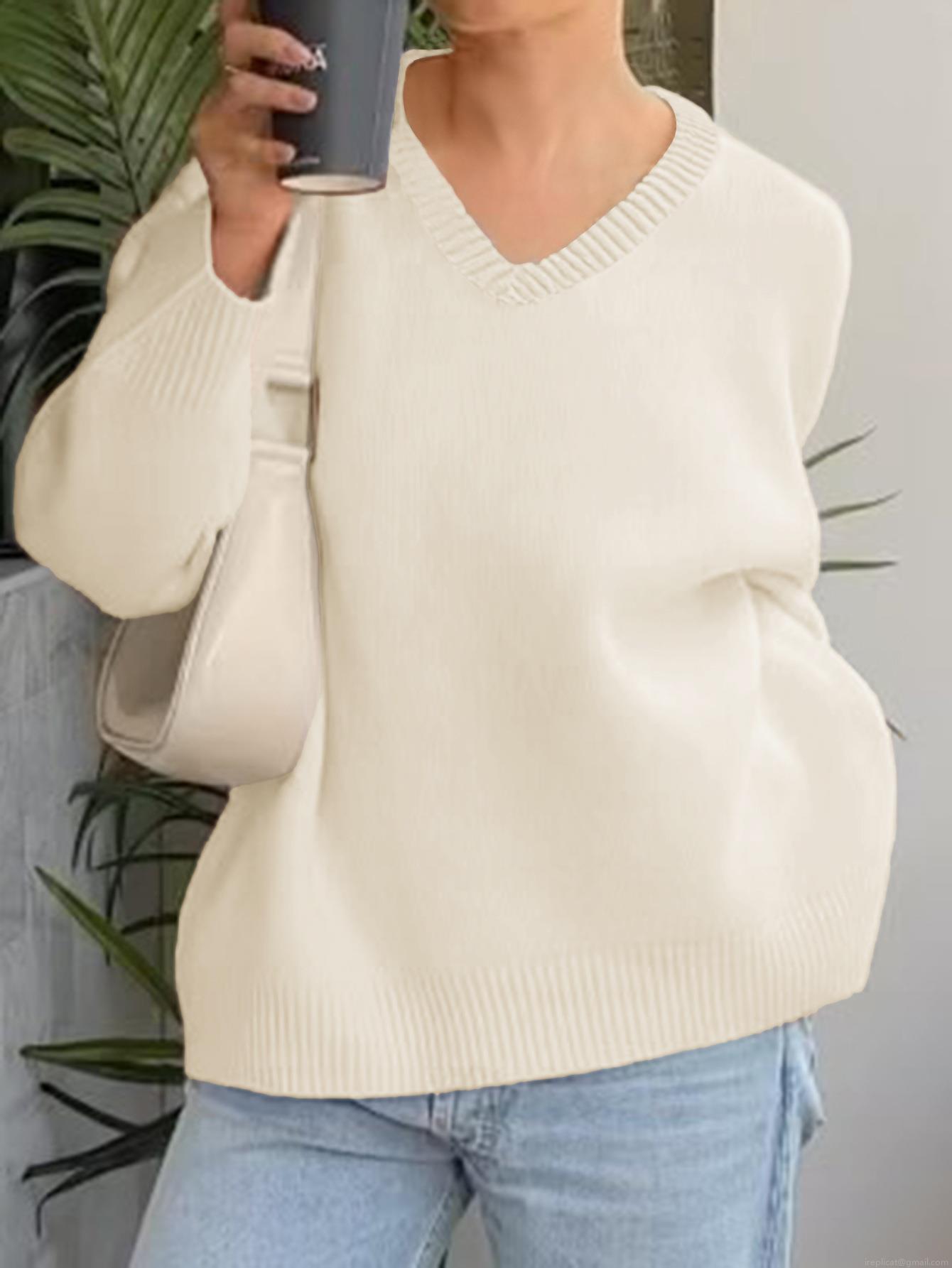 • Acrylic Polyamide Polyester Blend Women's V Neck Knitted Sweater Loose Long Sleeve Solid Color Casual Soft Pullover Knit Top For Autumn Winter