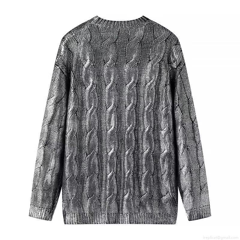 • Fashionable Women's Cable Knit Sweater Grey Silver Gradient Long Sleeve Round Neck Pullover With Metallic Gold Stamping Streetwear Winter Knitwear Top