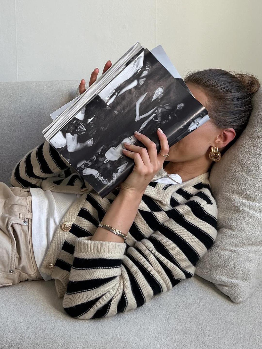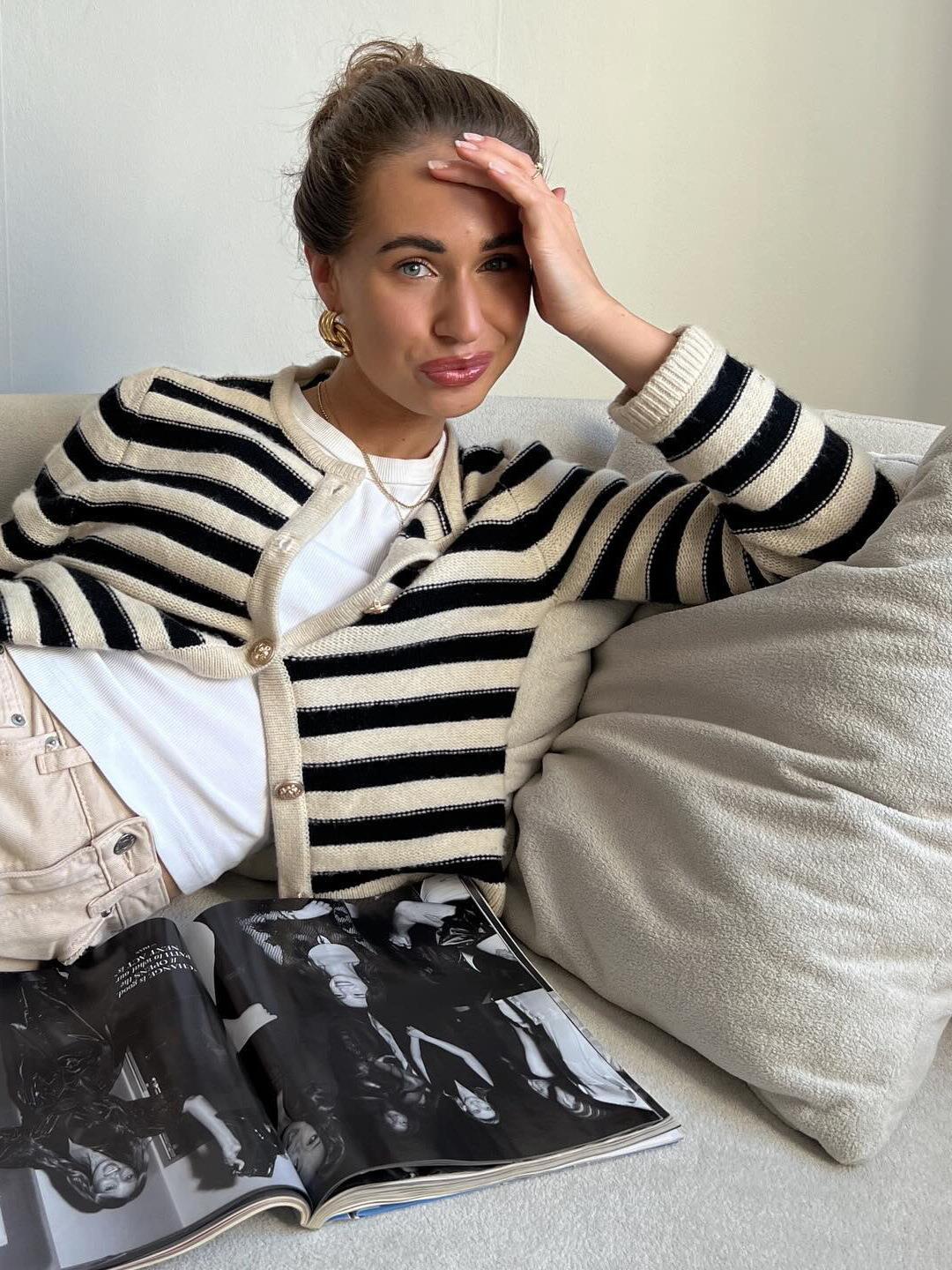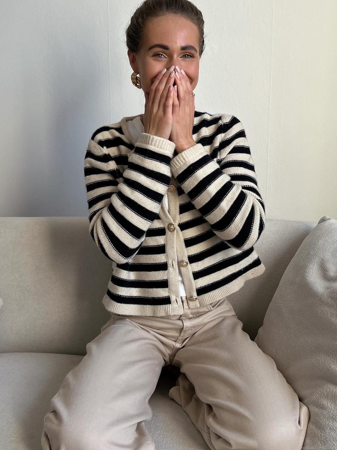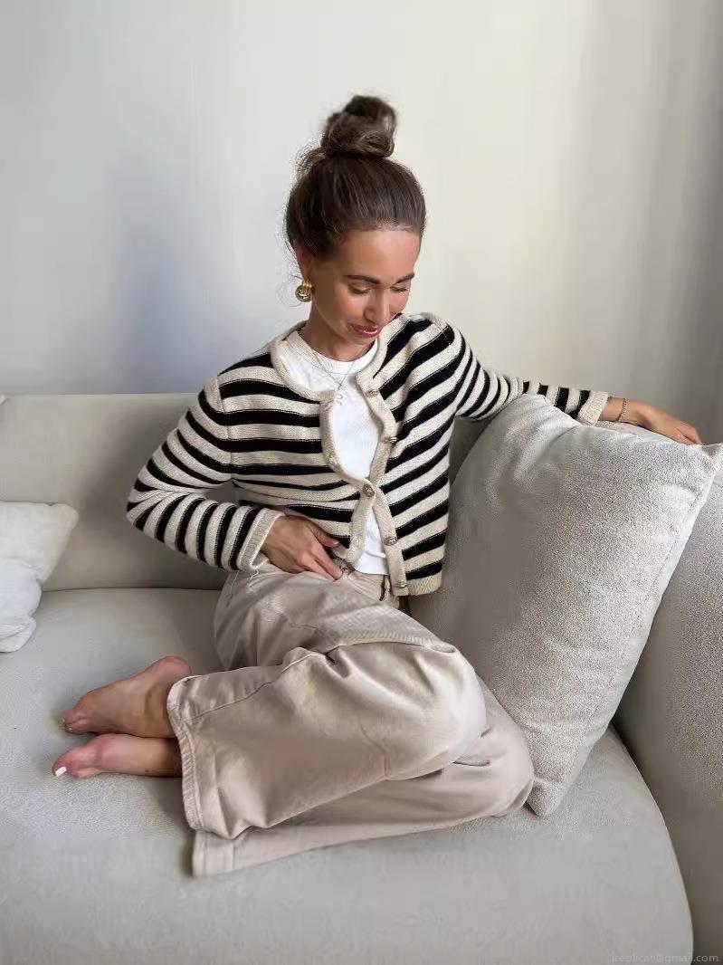 • French Style Retro Striped Knit Cardigan For Women Cotton Wool Blend Round Neck Long Sleeve Sweater With Gold Buttons Autumn Winter Slim Top