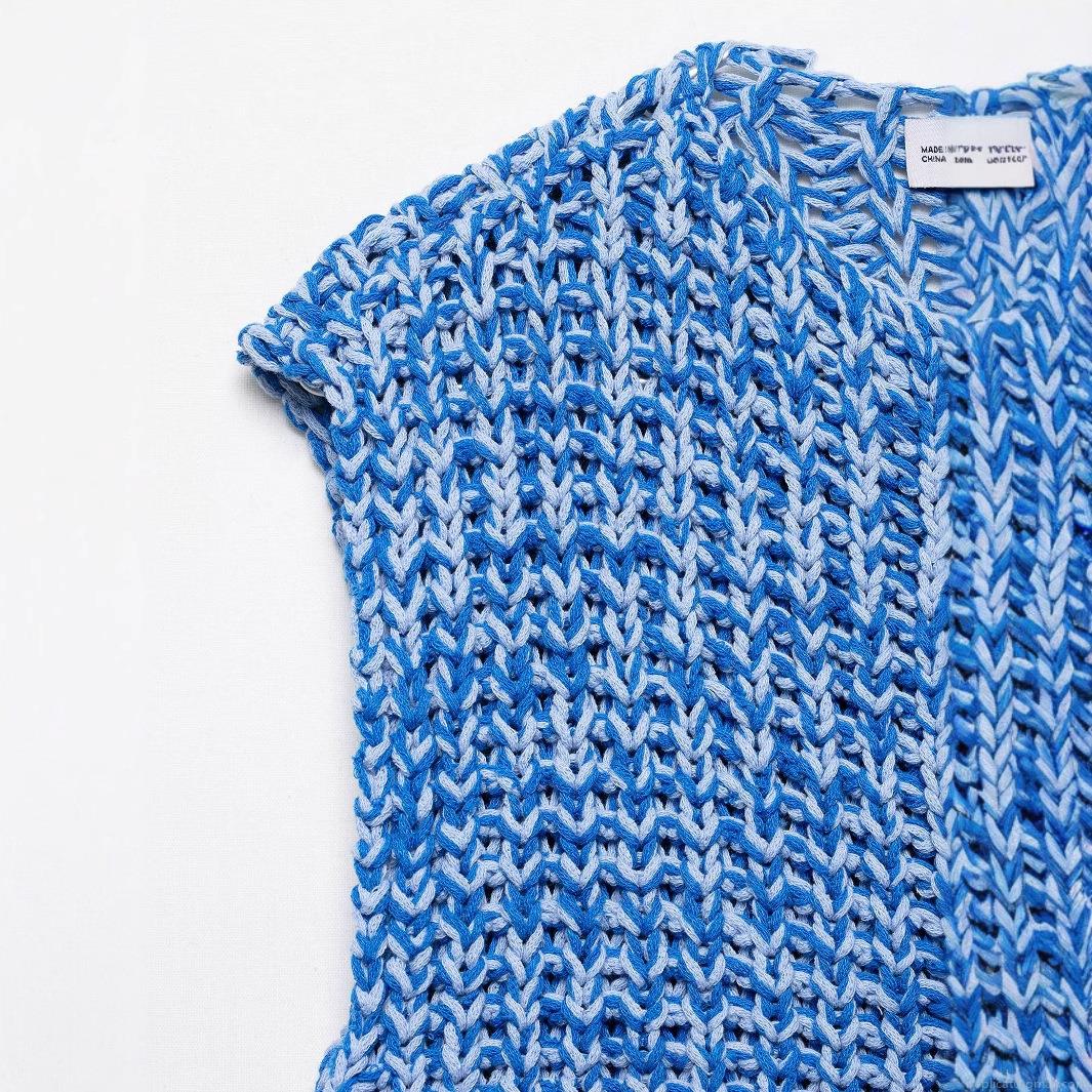 French Style Slim Fit Chunky Knit Vest Cardigan For Women Sleeveless Button Up Mixed Blue Polyester Top With Pockets Daily Dating Chic Lady Knitwear